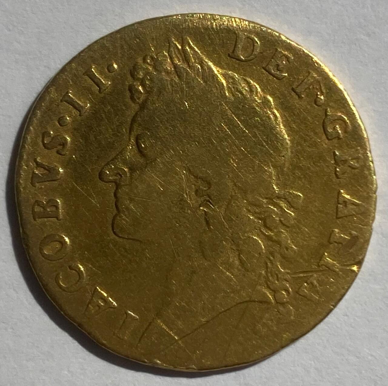 The coin is made of 22 carat gold, and weighs 8.4 grams. The 1688 James II gold guinea has not been cleaned, polished or ex mount.Summary