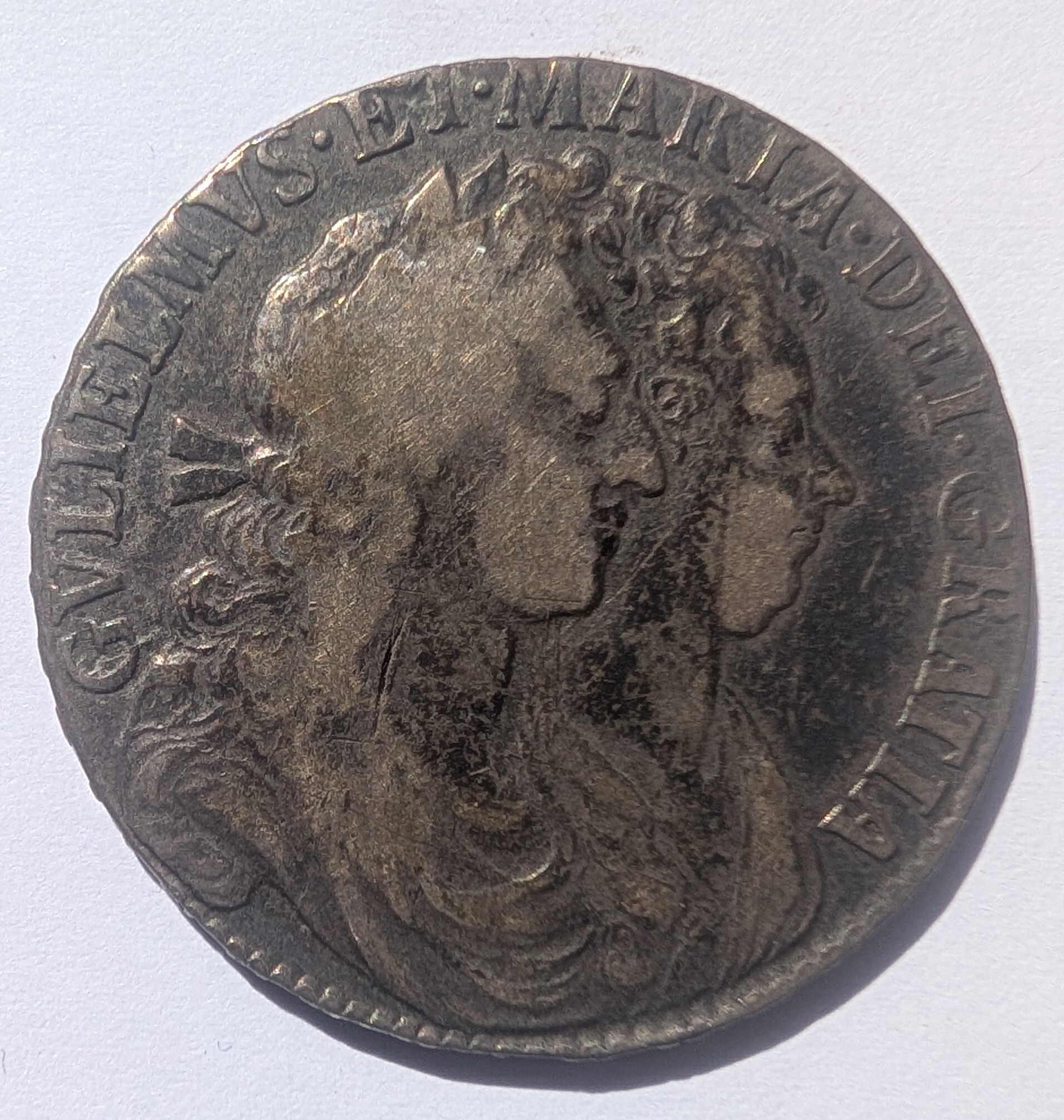 1689 William and Mary Half Crown. Made from Sterling Silver (0.925 fine). Conjoined busts of William and Mary can be found on the obverse of the coin. The reverse of the coin depicts a crowned quartered shield of arms, with the date seen either side of the crown.