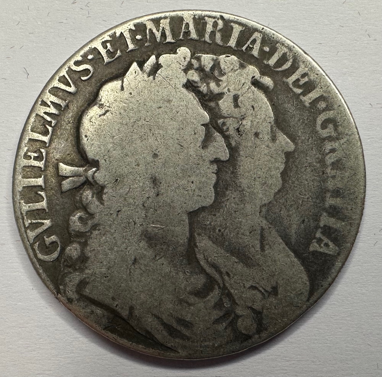 The 1689 half crown depicts on the obverse the conjoined portrait of King William and Queen Mary.