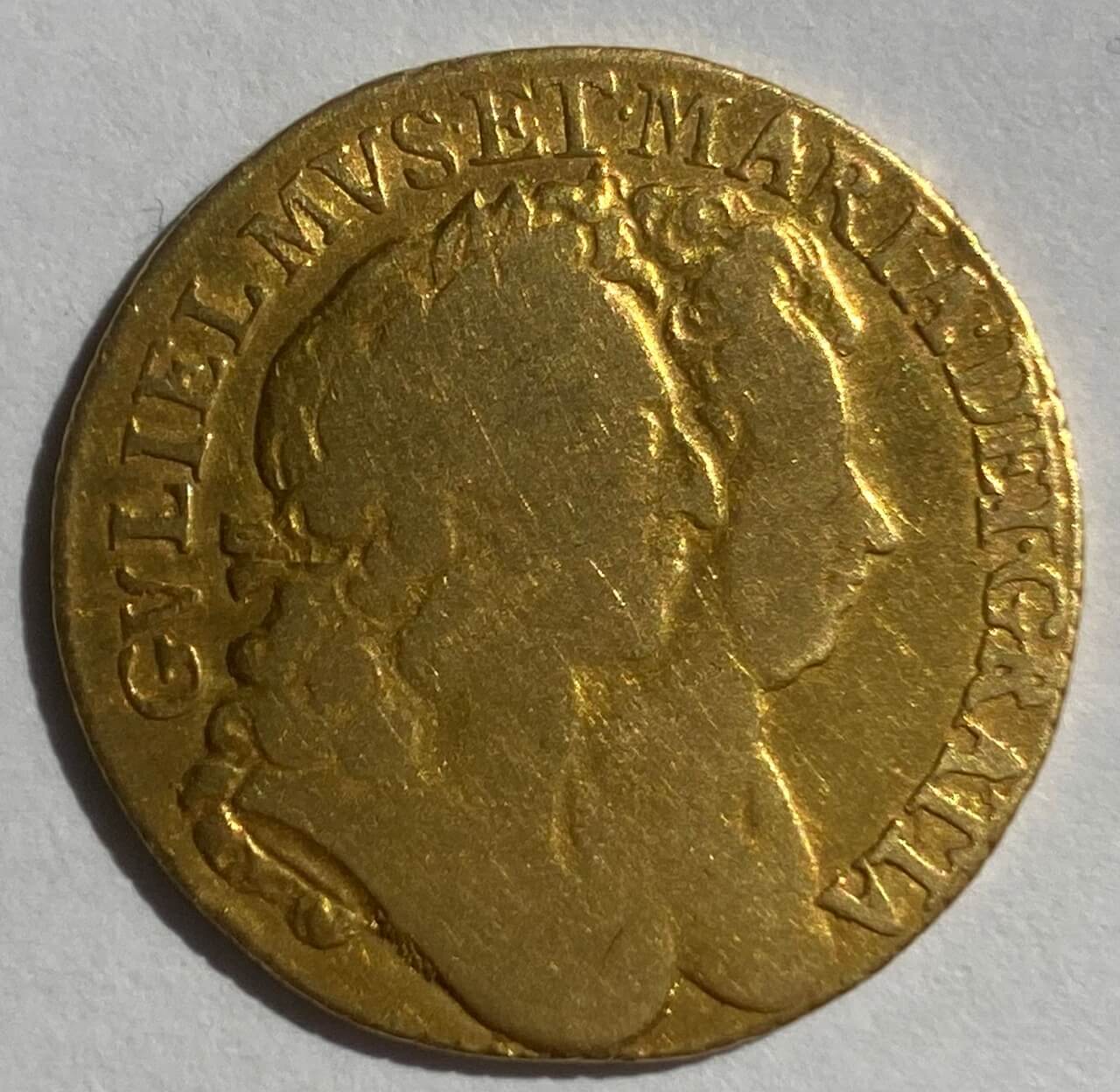 The 1690 gold guinea was issued during the reign of William and Mary.
