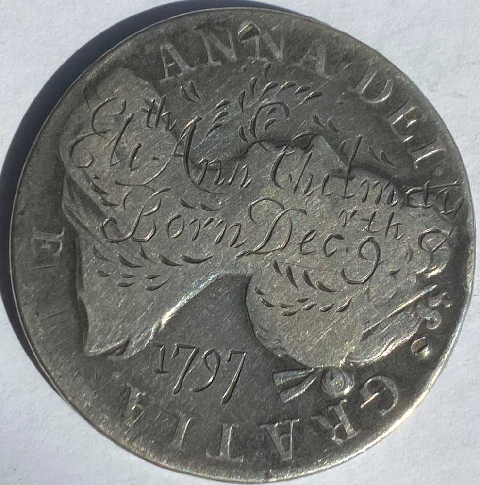 1707 Queen Anne Silver Crown - engraved Coin metal: Silver Engraved 'Eli-Ann Chilmay born dec 9th 1797'Summary