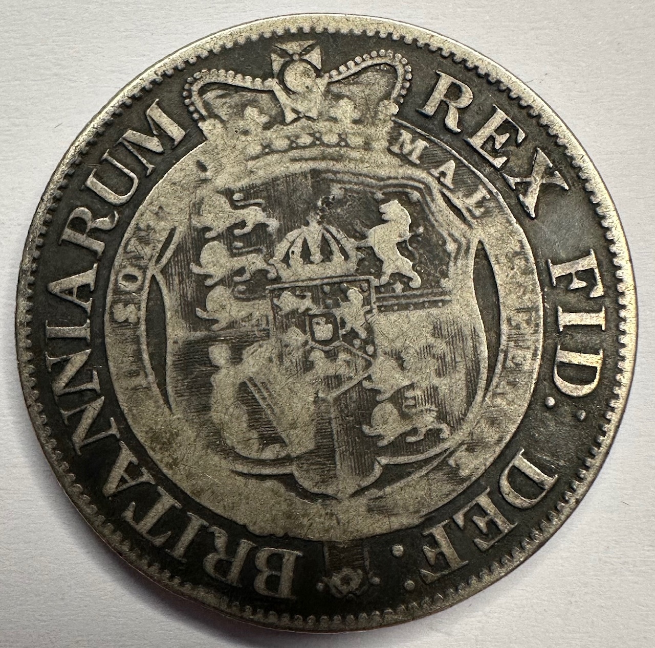 The half crown is made of sterling silver (0.925 fine), and depicts George III's laureate head on the obverse of the coin.