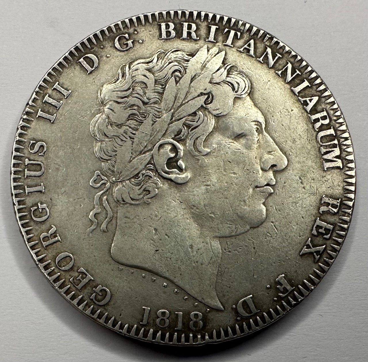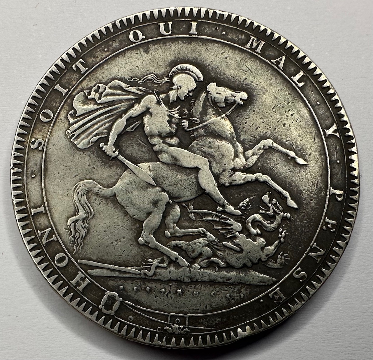 The coin is made of sterling silver, and weighs 28.2 grams. George III's laureate head is depicted on the obverse, with the reverse featuring Benedetto Pistrucci's portrayal of St George and the Dragon.