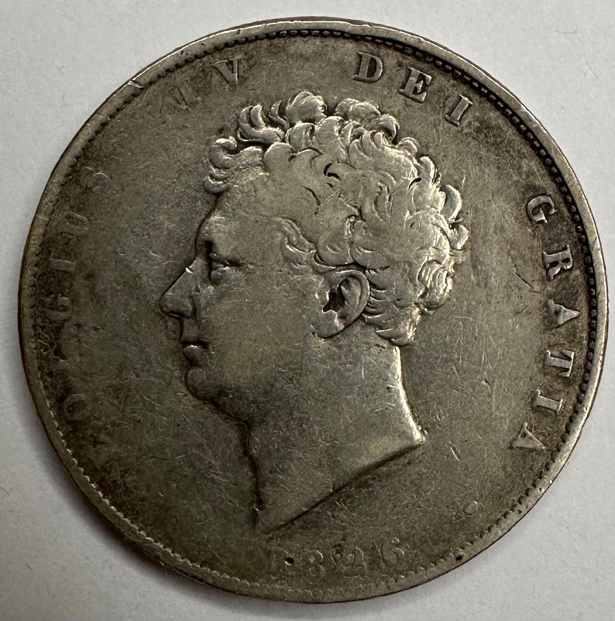 George IV's bare head is depicted on the obverse of the coin, with a crowned shield and crest on the reverse.