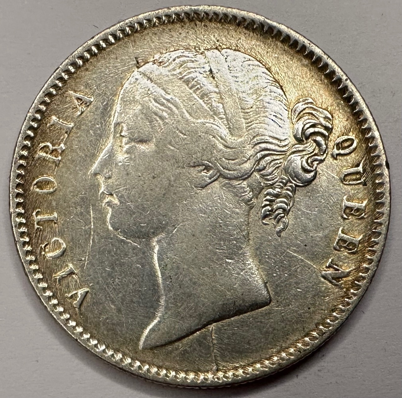 The silver one rupee is made of 0.917 fine silver, and depicts a young portrait of Queen Victoria on the obverse of the coin.