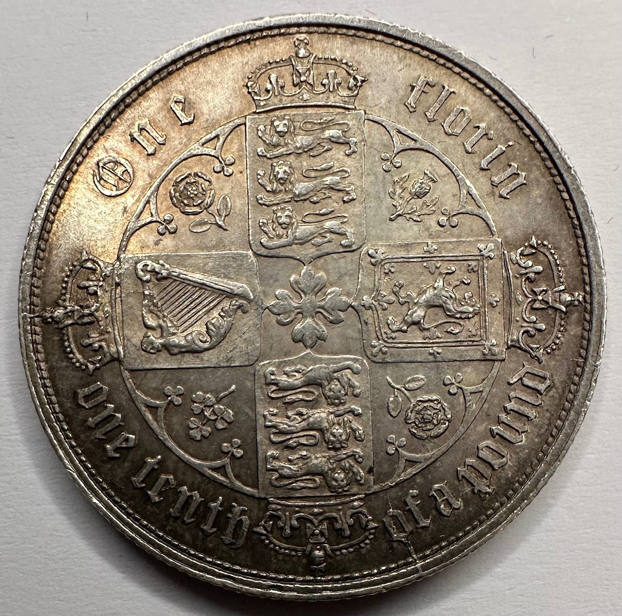 A Gothic portrait of Queen Victoria is depicted on the obverse, with crowned cruciform shields on the reverse. The date is displayed in Roman numerals.