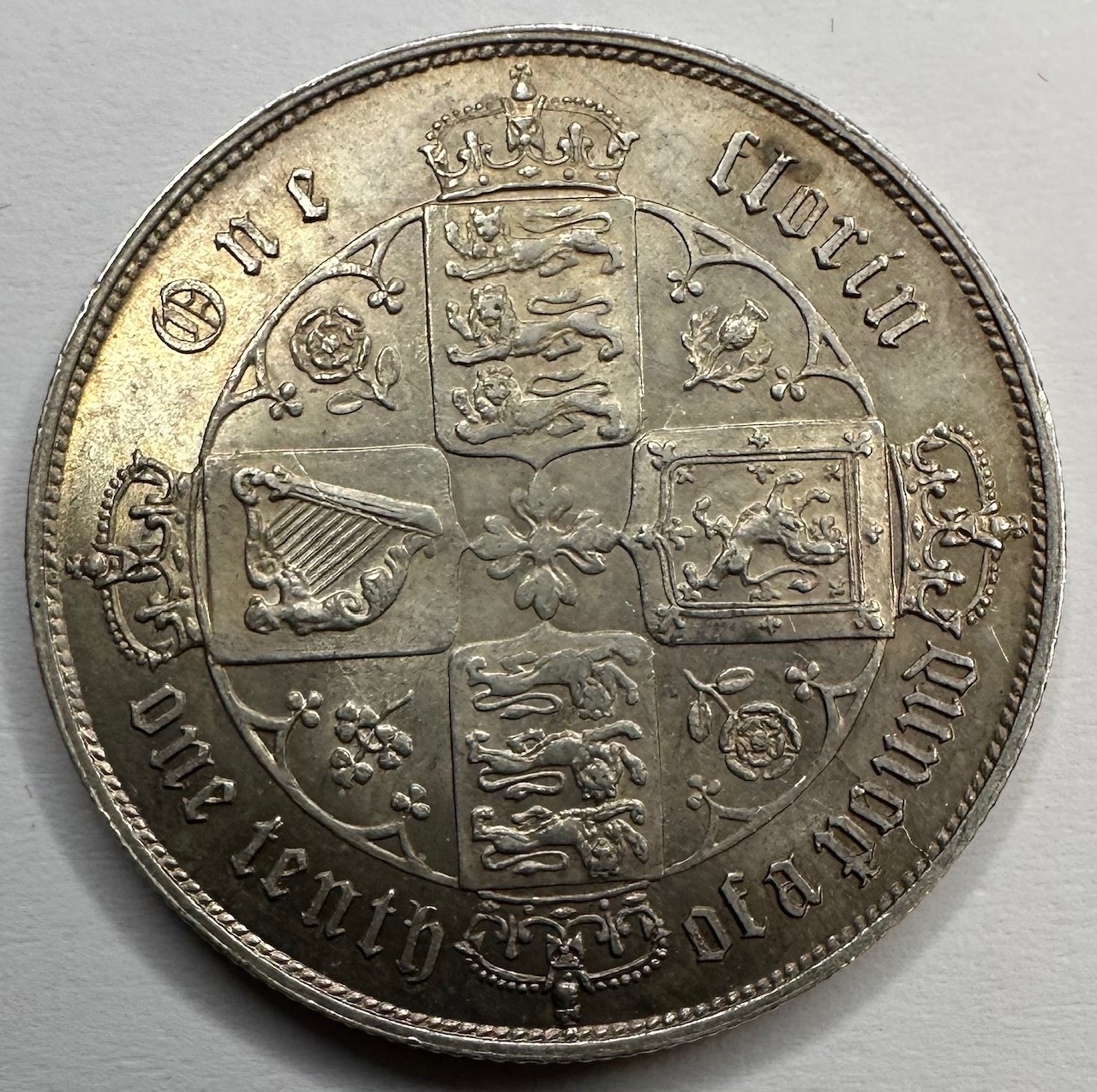 A Gothic portrait of Queen Victoria is depicted on the obverse, with crowned cruciform shields on the reverse. The date is displayed in Roman numerals.