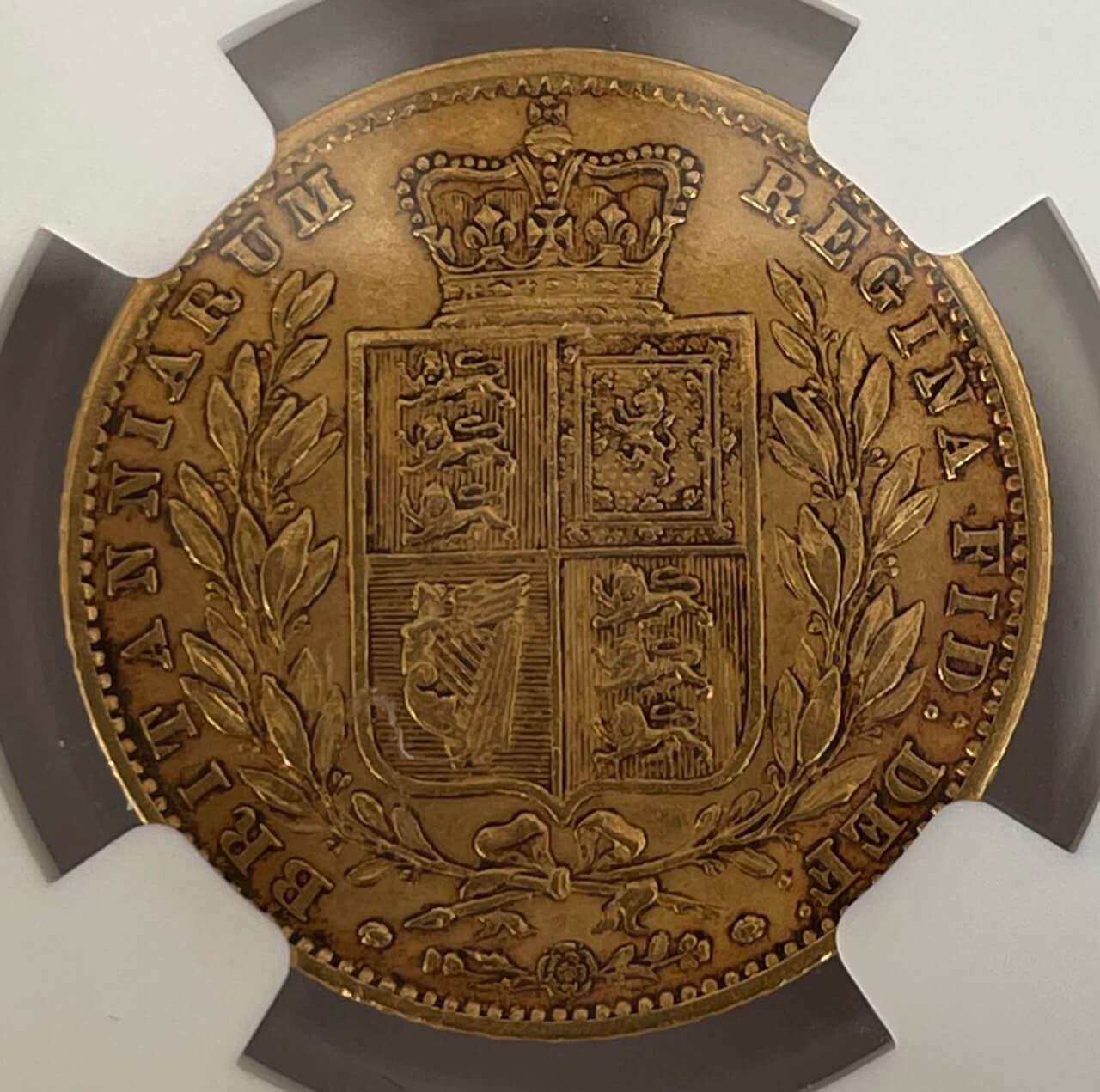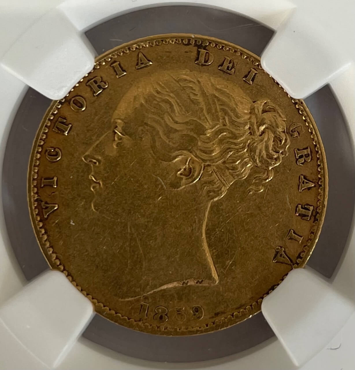 The Ansell sovereign was only issued in 1859, and can be recognised with a distinct extra ribbon on the Queen’s hairband.