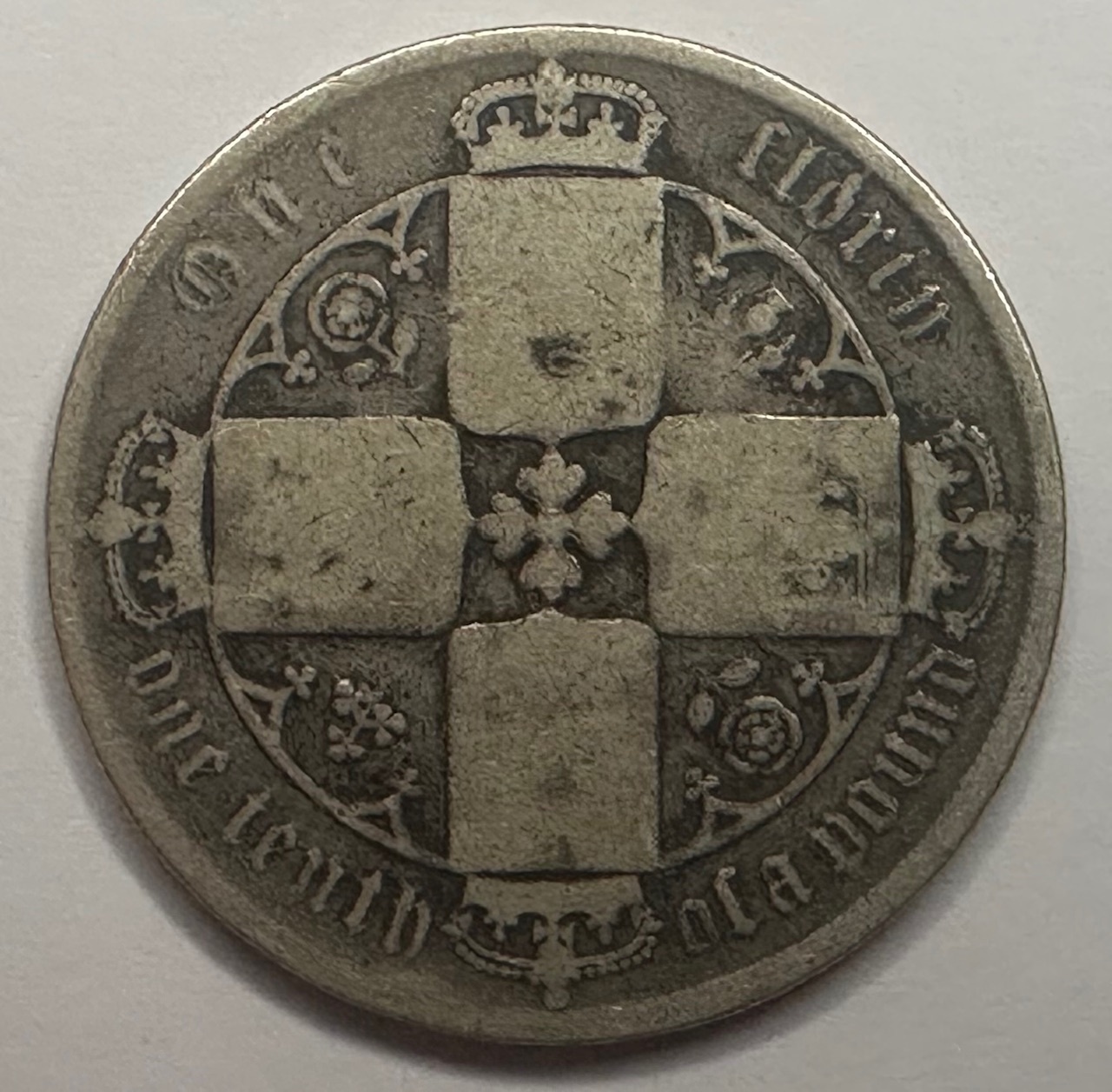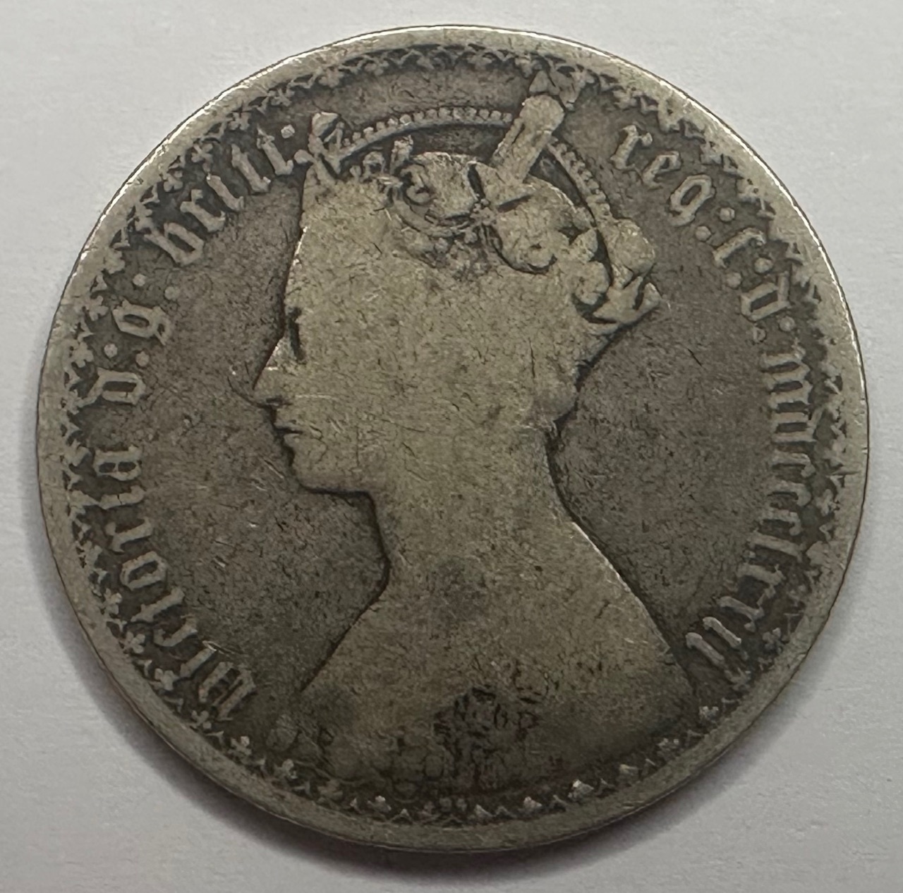 A Gothic portrait of Queen Victoria is depicted on the obverse, with crowned cruciform shields on the reverse. The date is displayed in Roman numerals.