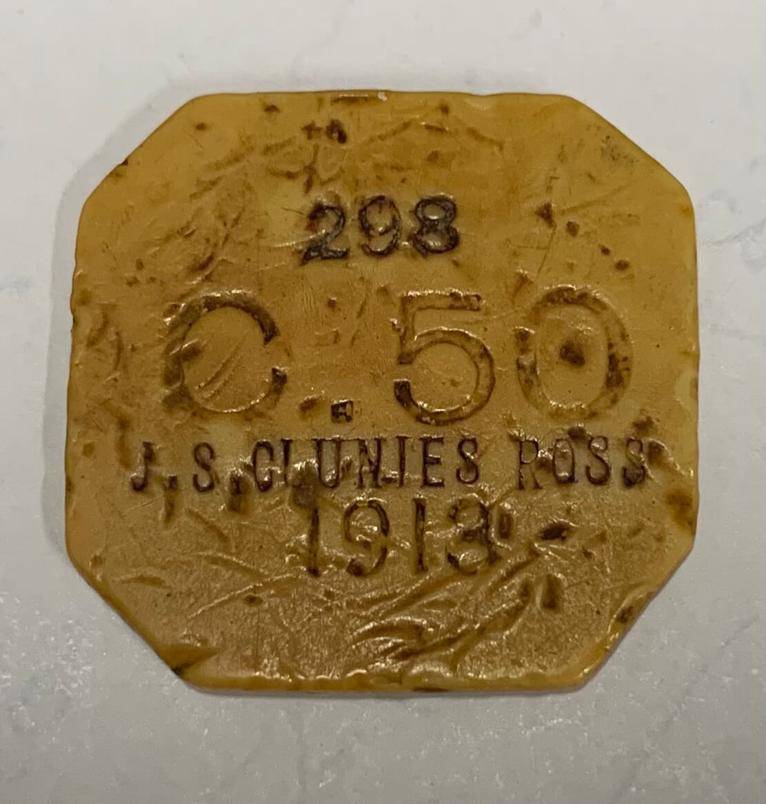 1913 Cocos Keeling Islands Australia 50 Cent Token In very good condition this Cocos Keeling Islands 50 Cents is made from ivory plastic. The 1913 50 cent token had a mintage of 2000 with this token marked 298 and is octagonal in shape. The currency on these islands in 1913 was the rupee. The lettering reads: 298 C 50 J S CLUNIES ROSS 1913Summary
