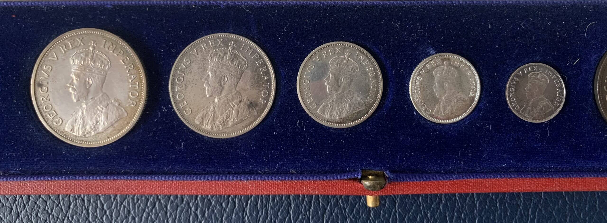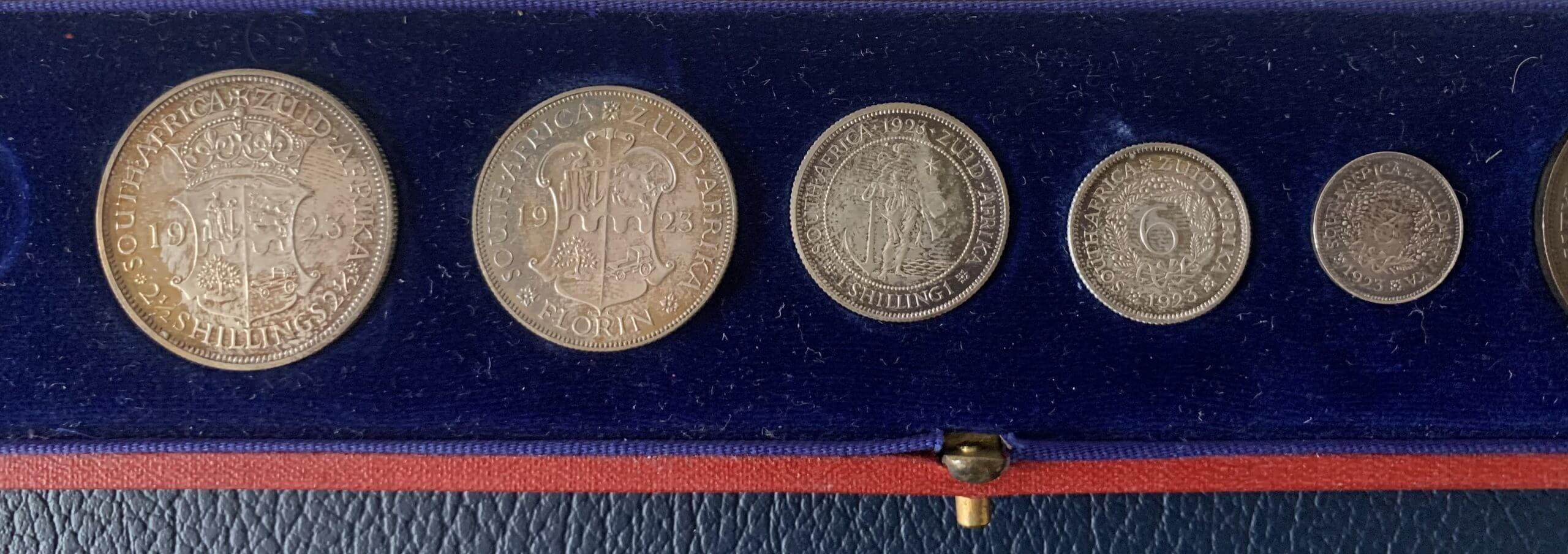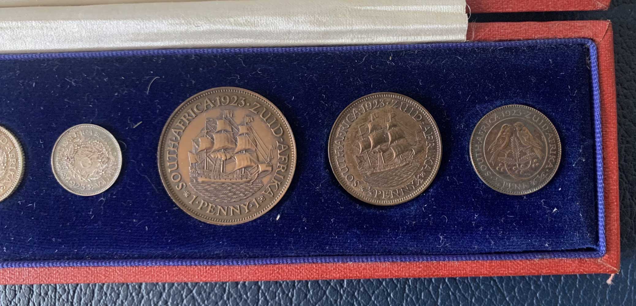 The set was the first coinage to be issued by the Union of South Africa. The set for sale is missing the two gold coins, the 1923 South Africa gold proof sovereign and half sovereign, but contains the silver proof half crown, florin, shilling, sixpence and threepence, along with the copper penny, half penny and farthing. The coins are in good condition, but have been cleaned at some point during their life. Only 655 sets were issued by the South African Mint. The coins are housed in their original dark red Mappin and Webb presentation case. Due to the low mintage, these sets are extremely difficult to find.Summary