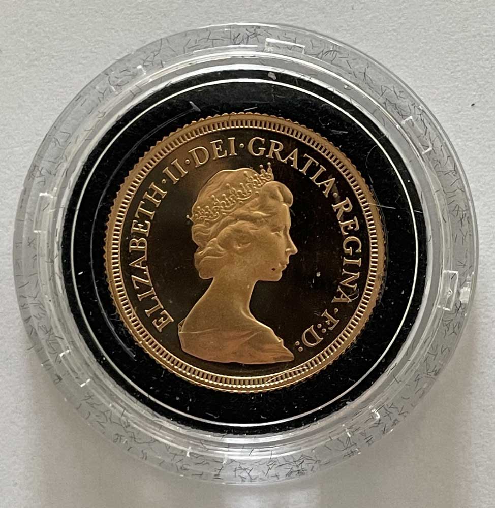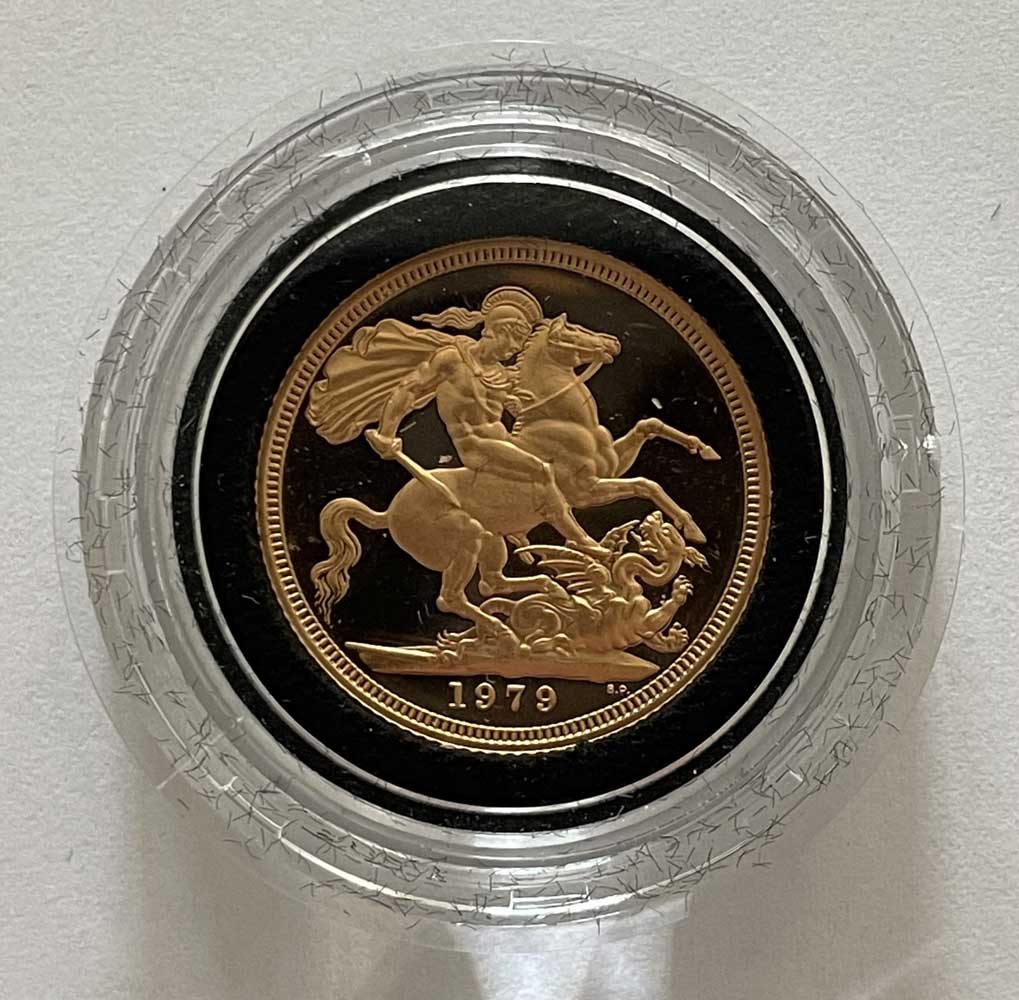 1979 Gold Proof Sovereign Benedetto Pistrucci’s famous portrayal of St. George slaying the dragon is depicted on the reverse of the coin. Queen Elizabeth II’s second portrait can be seen on the obverse, designed by Arnold Machin. The sovereign is made of 22 carat gold, and weighs 7.98 grams. It contains 0.2354 ounce of fine gold. The 1979 gold proof sovereign is housed in a Royal Mint acrylic screw top capsule, presented in its Royal Mint blue leatherette case. The 1979 gold proof sovereign was never issued with a certificate of authenticity. Only 50,000 individually boxed proof sovereigns were issued by the Royal Mint in 1979. It was the first modern gold proof sovereign to be issued.