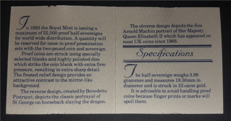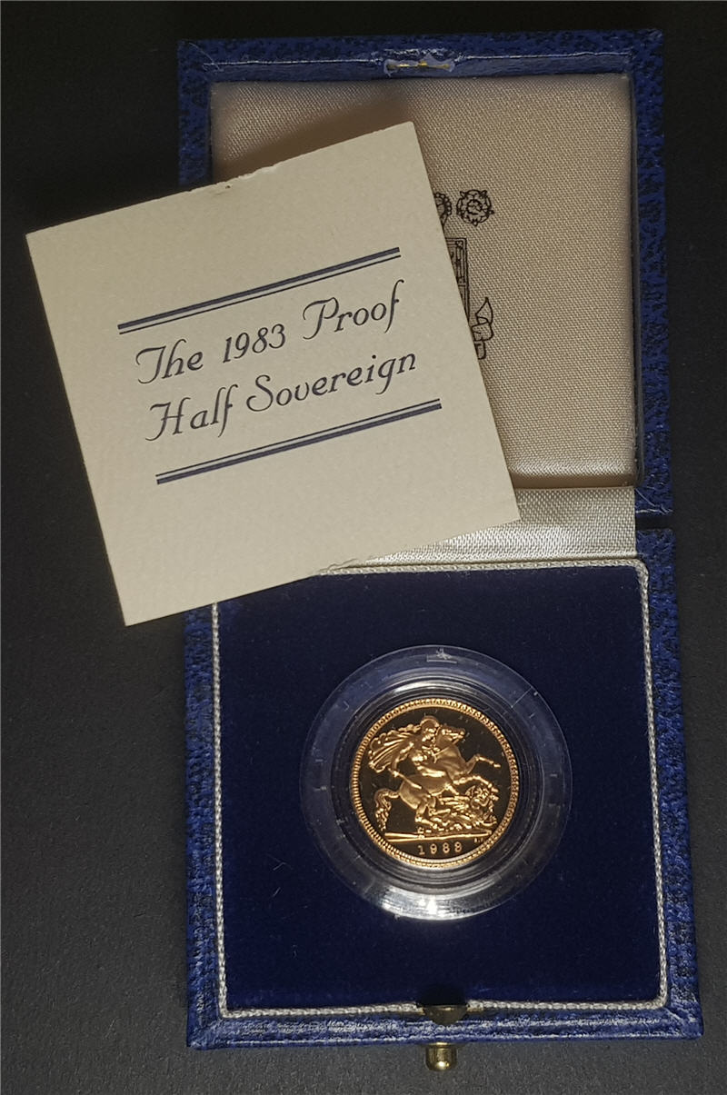 The 1983 Gold Half-Sovereign Proof is an example of the Gold Half-Sovereign and is a gold coin, being as it suggests, half the value and half of the gold weight of a gold sovereign. Today, the half-sovereign is a commemorative coin, not issued every year and often only collected as part of a set.