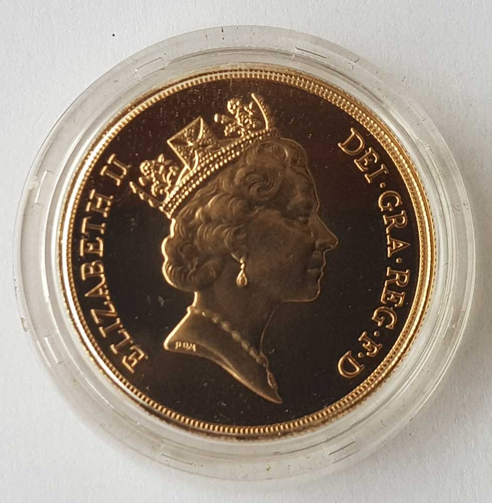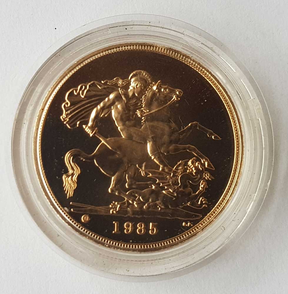 The 1985 brilliant uncirculated gold five pounds piece has a weight of 39.94 grams, with a diameter of 36.02mm.