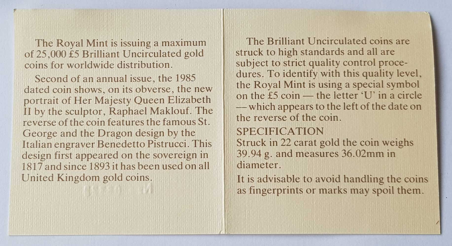 Only 13,626 BU gold five pounds pieces were issued by the Royal Mint in 1985.