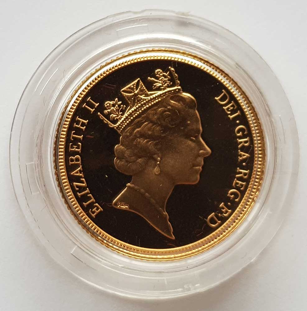 1986 Gold Proof Sovereign Benedetto Pistrucci's famous portrayal of St. George slaying the dragon is depicted on the reverse of the coin. Queen Elizabeth II's third portrait can be seen on the obverse, designed by Raphael Maklouf. The sovereign is made of 22 carat gold, and weighs 7.98 grams. It contains 0.2354 ounce of fine gold. The 1986 gold proof sovereign is housed in a Royal Mint acrylic screw top capsule, presented in its Royal Mint red leatherette case, accompanied with an individually numbered certificate of authenticity. Only 10,000 individually boxed proof sovereigns were issued by the Royal Mint in 1986. Looking to SELL GOLD SOVEREIGNS? Please visit our Prices We Pay – Sovereigns Page The first modern gold proof sovereign was issued by the Royal Mint in 1979. Since then, a gold proof sovereign has been issued every year by the Royal Mint. Proof sovereigns are superior in quality compared to standard bullion sovereigns, with highly polished fields, and cameo raised portraits on the obverse and reverse. Gold proof sovereigns are released in a Royal Mint presentation case with a certificate of authenticity. Proof sovereigns often depict Benedetto Pistrucci's famous portrayal of St George and the dragon on the reverse of the coin. The reverse design has been changed several times for special commemorative years, such as the 1989 500th anniversary of the sovereign, and the 2002 Golden Jubilee. M J Hughes Coins are members of the British Numismatic Trade Association – www.bnta.net. We are coin dealers based in Alton, Hampshire (Where we have a shop location). We are always interested in purchasing any coins that you may have for sale, particularly Royal Mint issues and gold coins. We are happy to make no obligation offers, and purchase from a single coin to an entire gold coin collection. You would be more than welcome to visit our shop, or we are happy to travel to you. Please get in contact with us if you would like to discuss further.Summary