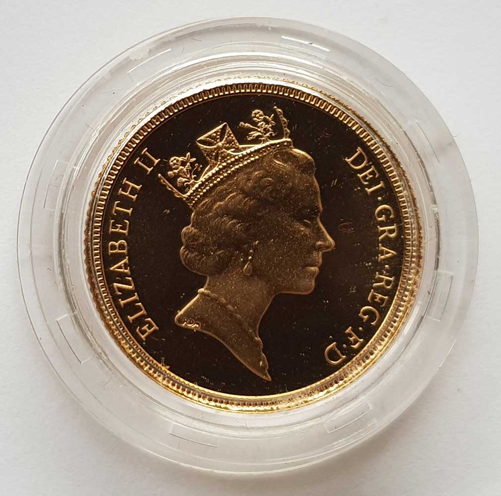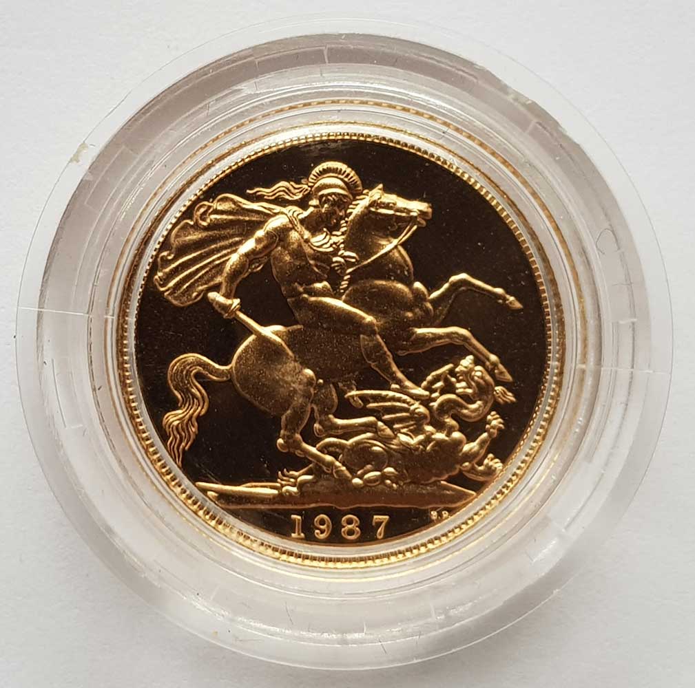 1987 Gold Proof Sovereign Benedetto Pistrucci's famous portrayal of St. George slaying the dragon is depicted on the reverse of the coin. Queen Elizabeth II's third portrait can be seen on the obverse, designed by Raphael Maklouf. The sovereign is made of 22 carat gold, and weighs 7.98 grams. It contains 0.2354 ounce of fine gold. The 1987 gold proof sovereign is housed in a Royal Mint acrylic screw top capsule, presented in its Royal Mint red leatherette case, accompanied with an individually numbered certificate of authenticity. Only 10,000 individually boxed proof sovereigns were issued by the Royal Mint in 1987. Looking to SELL GOLD SOVEREIGNS? Please visit our Prices We Pay – Sovereigns Page The first modern gold proof sovereign was issued by the Royal Mint in 1979. Since then, a gold proof sovereign has been issued every year by the Royal Mint. Proof sovereigns are superior in quality compared to standard bullion sovereigns, with highly polished fields, and cameo raised portraits on the obverse and reverse. Gold proof sovereigns are released in a Royal Mint presentation case with a certificate of authenticity. Proof sovereigns often depict Benedetto Pistrucci's famous portrayal of St George and the dragon on the reverse of the coin. The reverse design has been changed several times for special commemorative years, such as the 1989 500th anniversary of the sovereign, and the 2002 Golden Jubilee. M J Hughes Coins are members of the British Numismatic Trade Association – www.bnta.net. We are coin dealers based in Alton, Hampshire (Where we have a shop location). We are always interested in purchasing any coins that you may have for sale, particularly Royal Mint issues and gold coins. We are happy to make no obligation offers, and purchase from a single coin to an entire gold coin collection. You would be more than welcome to visit our shop, or we are happy to travel to you. Please get in contact with us if you would like to discuss further.Summary