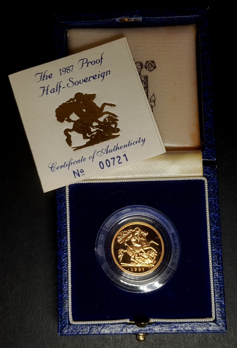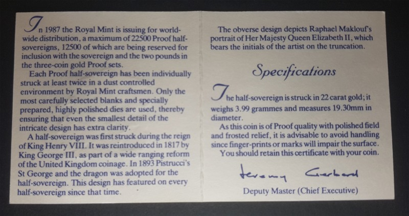 The 1987 Proof Half-Sovereign is an example of the Gold Half-Sovereign and is a gold coin, being as it suggests, half the value and half of the gold weight of a gold sovereign. Today, the half-sovereign is a commemorative coin, not issued every year and often only collected as part of a set.