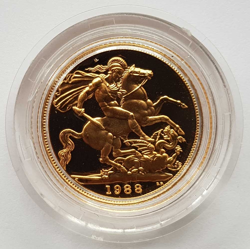 1988 Gold Proof Sovereign Benedetto Pistrucci's famous portrayal of St. George slaying the dragon is depicted on the reverse of the coin. Queen Elizabeth II's third portrait can be seen on the obverse, designed by Raphael Maklouf. The sovereign is made of 22 carat gold, and weighs 7.98 grams. It contains 0.2354 ounce of fine gold. The 1988 gold proof sovereign is housed in a Royal Mint acrylic screw top capsule, presented in its Royal Mint red leatherette case, accompanied with an individually numbered certificate of authenticity. Only 10,000 individually boxed proof sovereigns were issued by the Royal Mint in 1988. Looking to SELL GOLD SOVEREIGNS? Please visit our Prices We Pay – Sovereigns Page The first modern gold proof sovereign was issued by the Royal Mint in 1979. Since then, a gold proof sovereign has been issued every year by the Royal Mint. Proof sovereigns are superior in quality compared to standard bullion sovereigns, with highly polished fields, and cameo raised portraits on the obverse and reverse. Gold proof sovereigns are released in a Royal Mint presentation case with a certificate of authenticity. Proof sovereigns often depict Benedetto Pistrucci's famous portrayal of St George and the dragon on the reverse of the coin. The reverse design has been changed several times for special commemorative years, such as the 1989 500th anniversary of the sovereign, and the 2002 Golden Jubilee. M J Hughes Coins are members of the British Numismatic Trade Association – www.bnta.net. We are coin dealers based in Alton, Hampshire (Where we have a shop location). We are always interested in purchasing any coins that you may have for sale, particularly Royal Mint issues and gold coins. We are happy to make no obligation offers, and purchase from a single coin to an entire gold coin collection. You would be more than welcome to visit our shop, or we are happy to travel to you. Please get in contact with us if you would like to discuss further.Summary