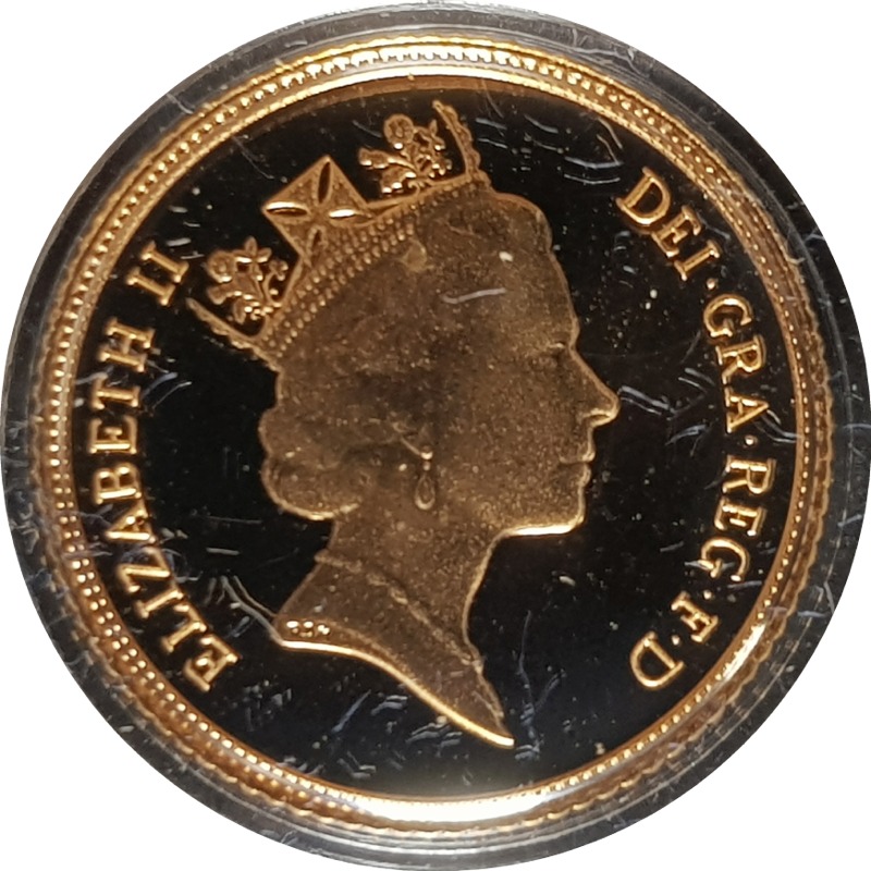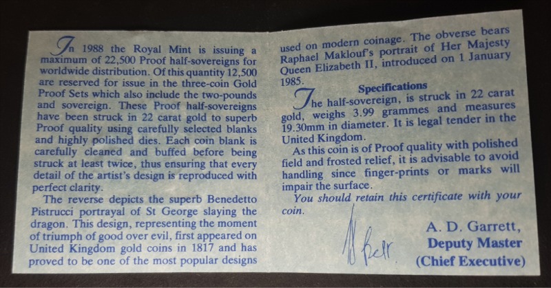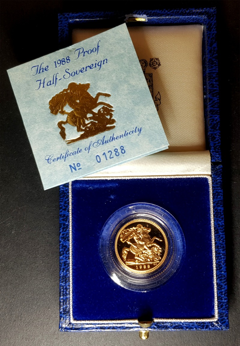 The 1988 Proof Half-Sovereign is an example of the Gold Half-Sovereign and is a gold coin, being as it suggests, half the value and half of the gold weight of a gold sovereign. Today, the half-sovereign is a commemorative coin, not issued every year and often only collected as part of a set.