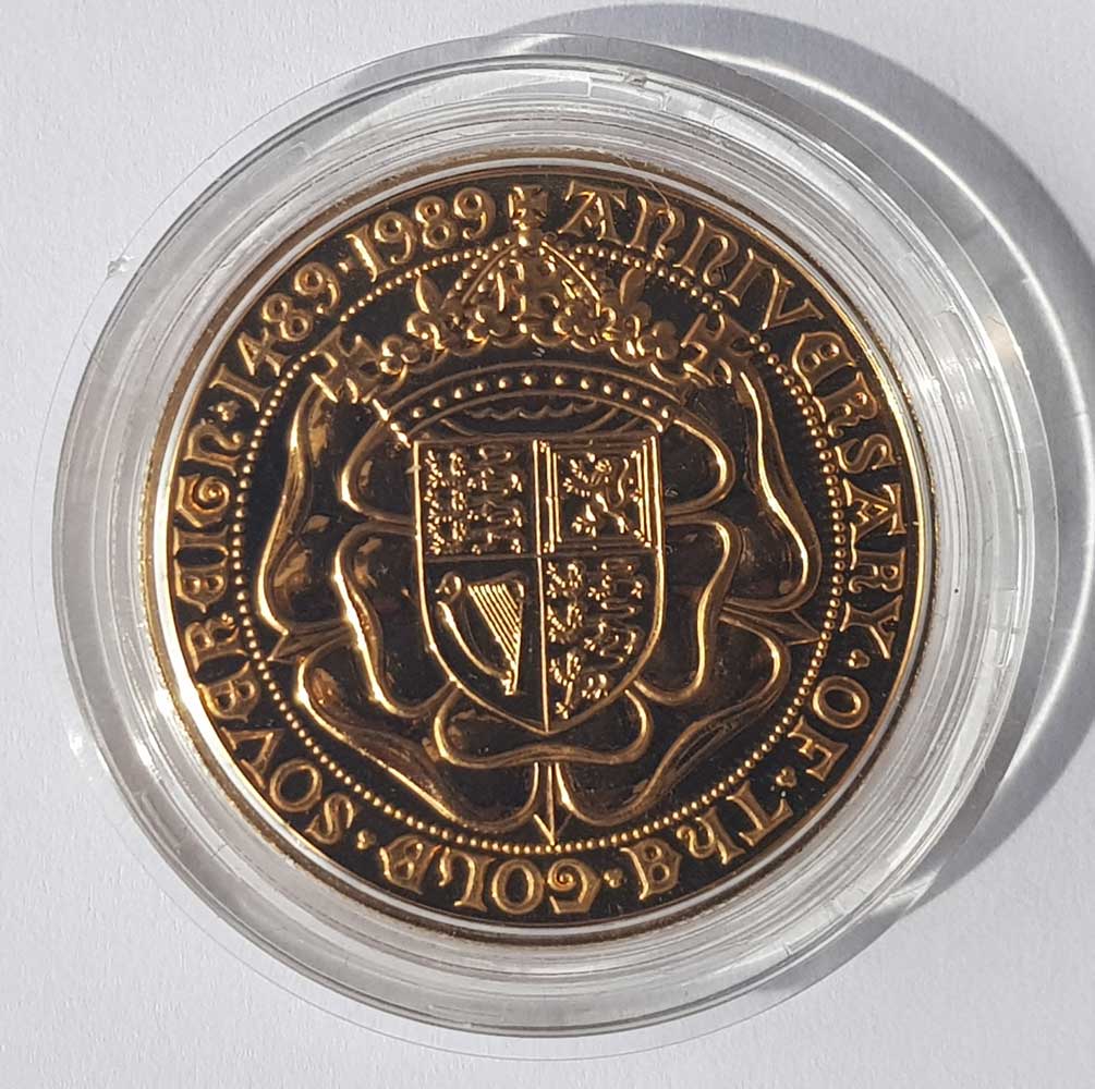 - To commemorate the 500th anniversary of the gold sovereign, a completely new design was created for the 1989 sovereign series. A design similar to that of the first gold sovereign issued in 1489 was chosen for the 1989 Brilliant Uncirculated Gold Five Pounds Piece.