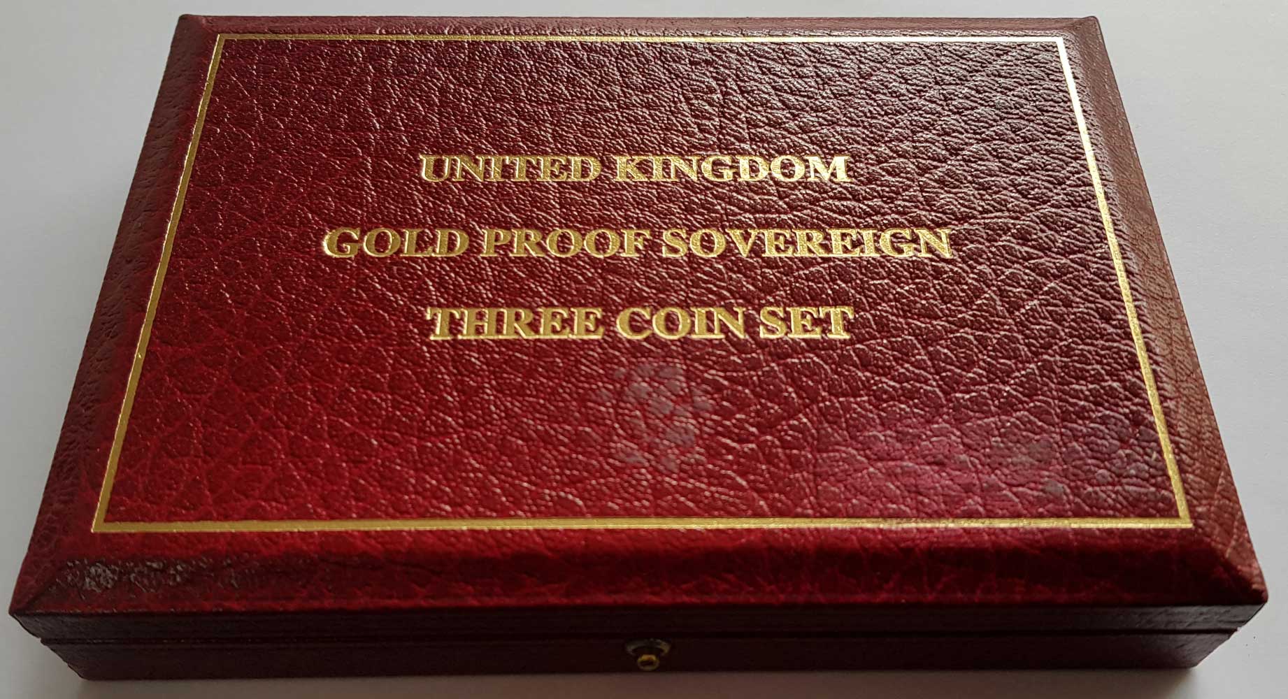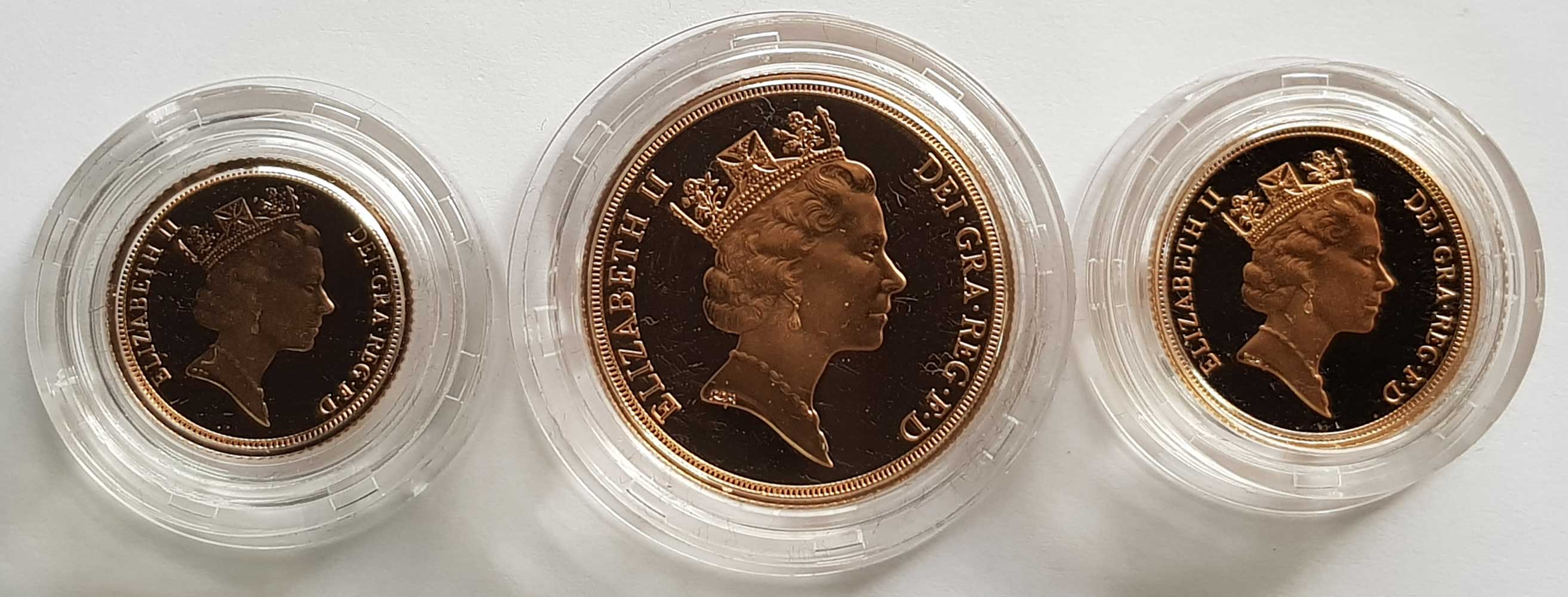 The 1990 3 coin gold proof sovereign set contains a gold proof two pounds (£2), sovereign and half sovereign.