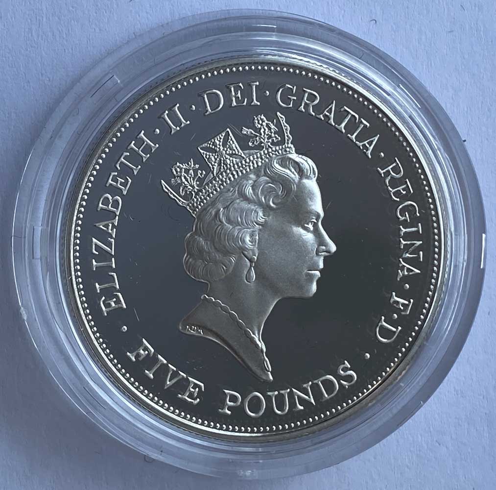Sterling Silver .925 Weight: 28.28 g Diameter: 38.61 millimeters The reverse designed by Leslie Durbin, portrays a cypher in the form of a letter "E" for Elizabeth in duplicate and interlaced, flanked by a rose and thistle. The obverse design is a portrait of Queen Elizabeth II with the denomination "five pounds" designed by Raphael Maklouf.Summary