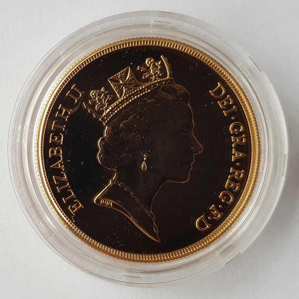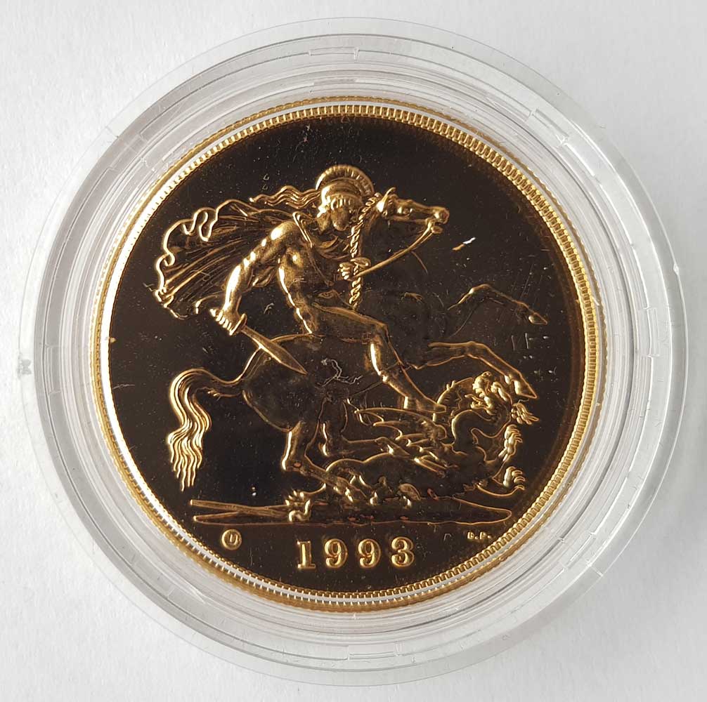 The 1993 Brilliant Uncirculated Gold Five Pounds Piece £5 depicts Benedetto Pistrucci's famous portrayal of St. George slaying the dragon on the reverse of the coin. A small circled 'U' to the left of the date means the coin is of BU quality. Queen Elizabeth II's third portrait can be seen on the obverse of the coin, designed by Raphael Maklouf. The coin is made of solid 22 carat gold (Gold fineness of 0.916), and is housed in its original Royal Mint acrylic screw top capsule. The coin is presented in its Royal Mint green velvet case, accompanied with an individually numbered certificate of authenticity. The 1993 brilliant uncirculated gold five pounds piece has a weight of 39.94 grams, with a diameter of 36.02mm. Only 906 BU gold five pounds pieces were issued by the Royal Mint in 1993. Looking to Sell Gold Coins, take a look at Prices We Pay The first gold five pound piece (£5) was issued during the reign of King George III in 1820. It was not issued as a circulation piece, but for the collectors market only. Gold five pounds pieces were also issued in 1826 and 1839 as part of a proof coin set. It wasn't until 1887 when a gold five pounds piece was issued for circulation purposes. There are two basic kinds of gold five pounds coin: the gold £5 (quintuple sovereign) type and the gold Crown. They are both made of 22 carat gold, and weigh exactly the same (39.94 grams). The diameter of the gold crown is slightly larger than the £5 piece. The first Brilliant Uncirculated gold five pounds was issued by the Royal Mint in 1984, and has been issued every year to present. M J Hughes Coins are members of the British Numismatic Trade Association – www.bnta.net. We are coin dealers based in Alton, Hampshire (Where we have a shop location). We are always interested in purchasing any coins that you may have for sale, particularly Royal Mint issues and gold coins. We are happy to make no obligation offers, and purchase from a single coin to an entire gold coin collection. You would be more than welcome to visit our shop, or we are happy to travel to you. Please get in contact with us if you would like to discuss further.Summary