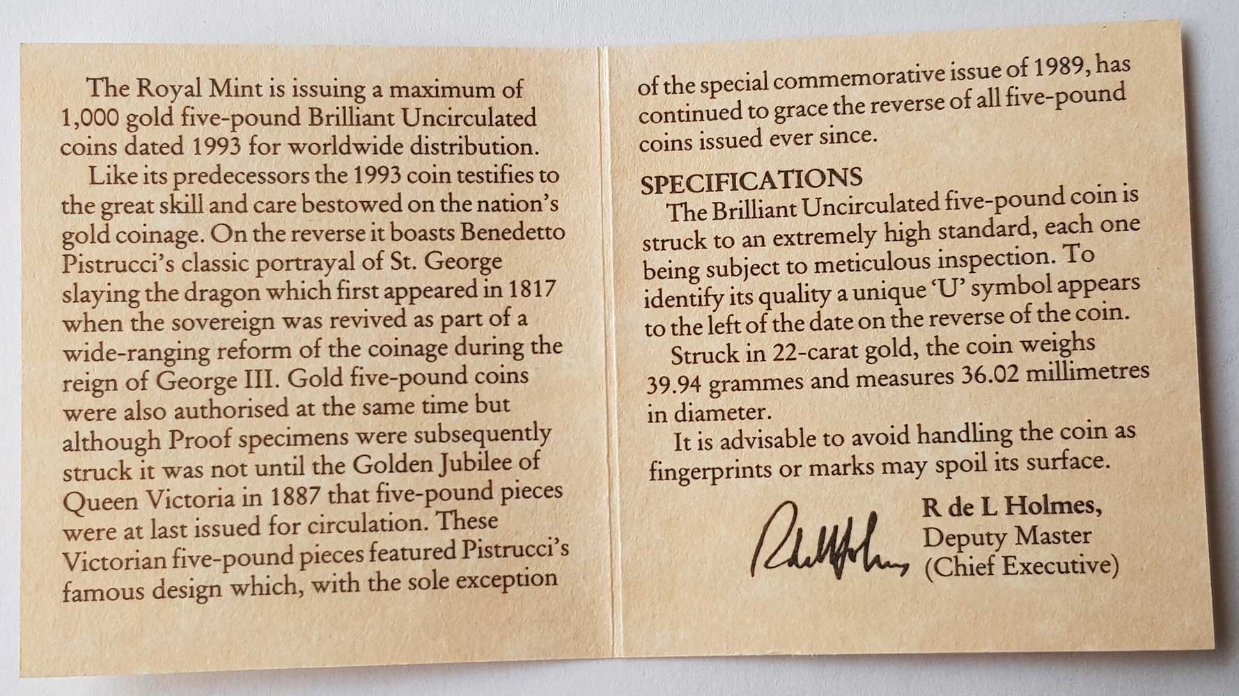 Only 906 BU gold five pounds pieces were issued by the Royal Mint in 1993.