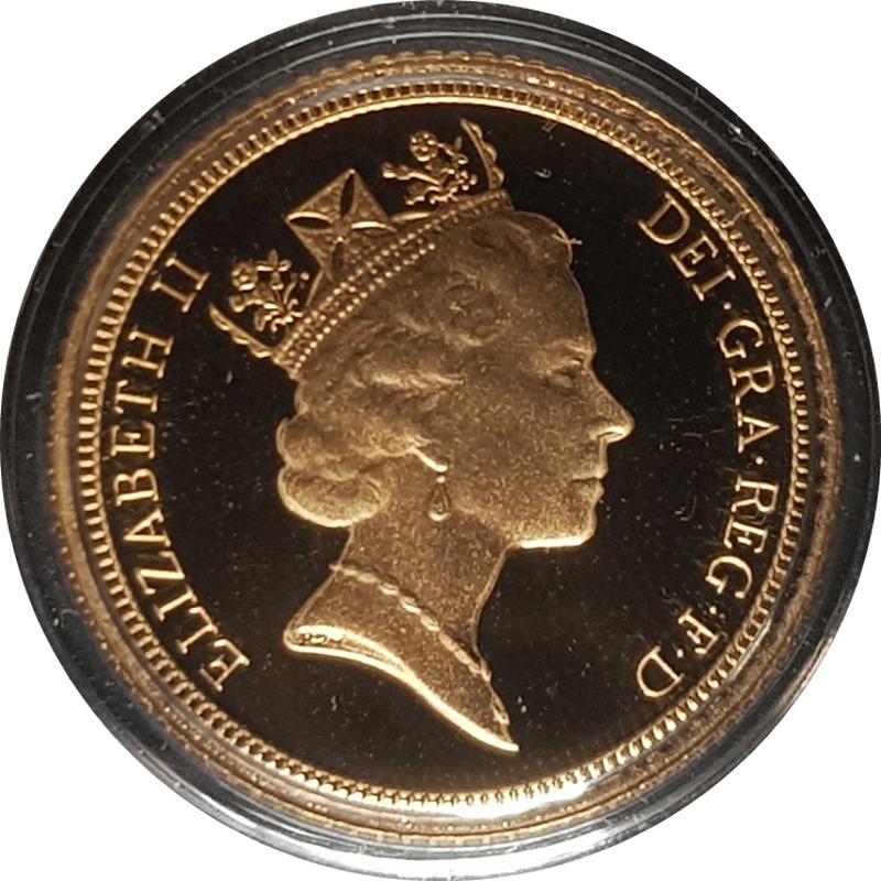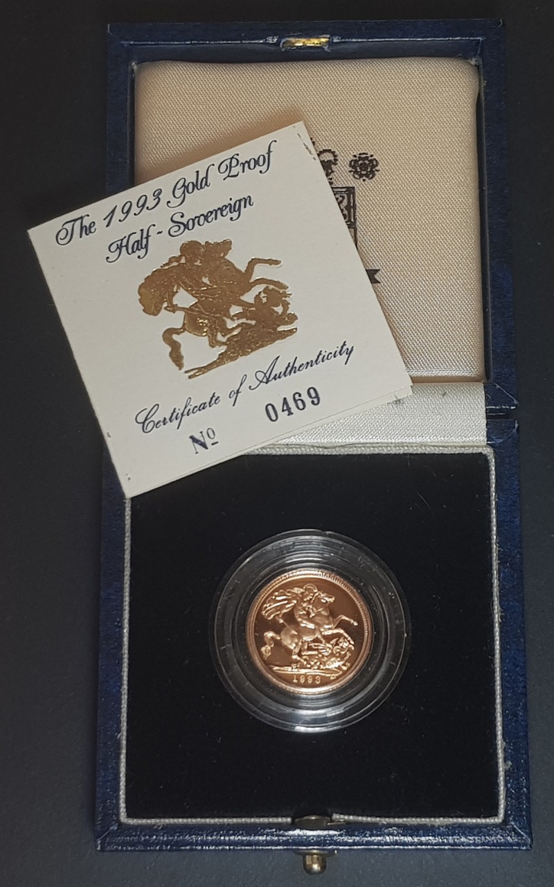 The 1993 Gold Proof Half-Sovereign is an example of the Gold Half-Sovereign and is a gold coin, being as it suggests, half the value and half of the gold weight of a gold sovereign. Today, the half-sovereign is a commemorative coin, not issued every year and often only collected as part of a set.
