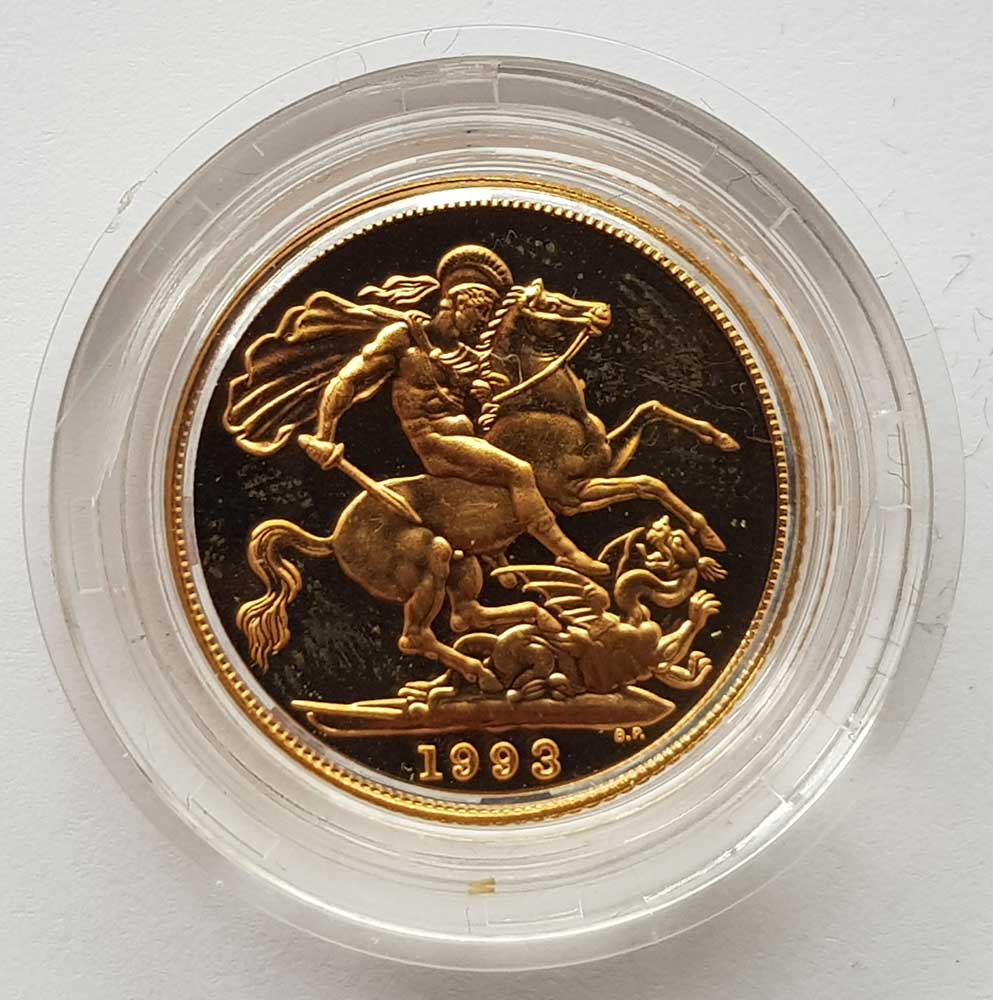 1993 Gold Proof Sovereign Benedetto Pistrucci's famous portrayal of St. George slaying the dragon is depicted on the reverse of the coin. Queen Elizabeth II's third portrait can be seen on the obverse, designed by Raphael Maklouf. The sovereign is made of 22 carat gold, and weighs 7.98 grams. It contains 0.2354 ounce of fine gold. The 1993 gold proof sovereign is housed in a Royal Mint acrylic screw top capsule, presented in its Royal Mint maroon leatherette case, accompanied with an individually numbered certificate of authenticity. Only 5,000 individually boxed proof sovereigns were issued by the Royal Mint in 1993. Looking to SELL GOLD SOVEREIGNS? Please visit our Prices We Pay – Sovereigns Page The first modern gold proof sovereign was issued by the Royal Mint in 1979. Since then, a gold proof sovereign has been issued every year by the Royal Mint. Proof sovereigns are superior in quality compared to standard bullion sovereigns, with highly polished fields, and cameo raised portraits on the obverse and reverse. Gold proof sovereigns are released in a Royal Mint presentation case with a certificate of authenticity. Proof sovereigns often depict Benedetto Pistrucci's famous portrayal of St George and the dragon on the reverse of the coin. The reverse design has been changed several times for special commemorative years, such as the 1989 500th anniversary of the sovereign, and the 2002 Golden Jubilee. M J Hughes Coins are members of the British Numismatic Trade Association – www.bnta.net. We are coin dealers based in Alton, Hampshire (Where we have a shop location). We are always interested in purchasing any coins that you may have for sale, particularly Royal Mint issues and gold coins. We are happy to make no obligation offers, and purchase from a single coin to an entire gold coin collection. You would be more than welcome to visit our shop, or we are happy to travel to you. Please get in contact with us if you would like to discuss further.Summary