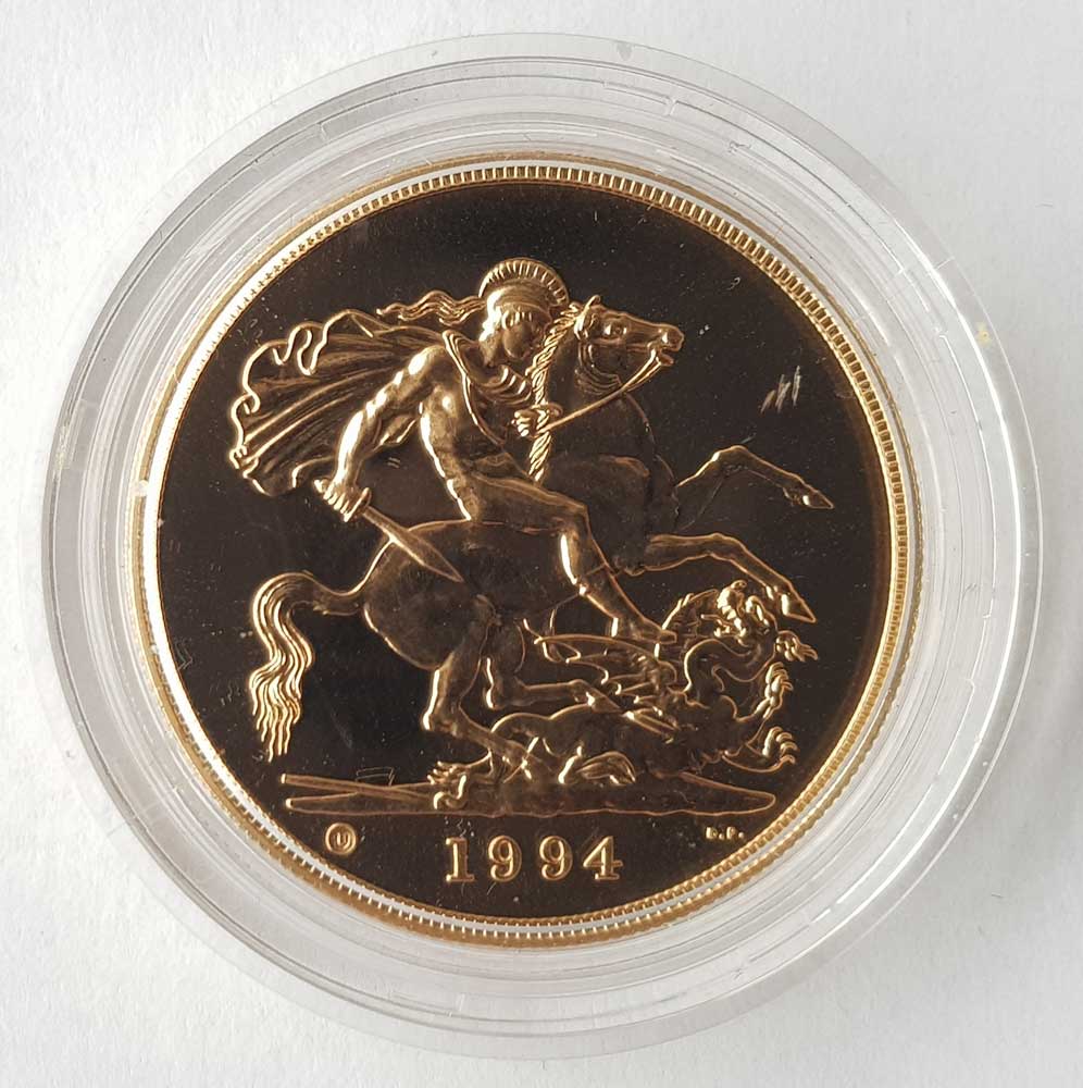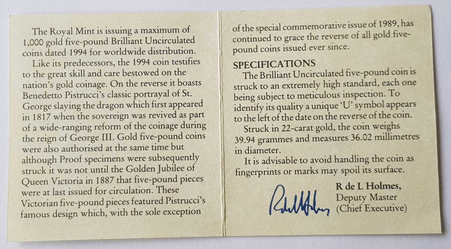 Only 1,000 BU gold five pounds pieces were issued by the Royal Mint in 1994.
