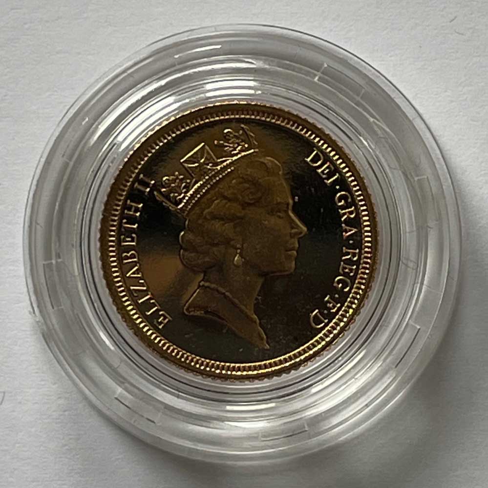 The 1994 Gold Proof Half-Sovereign is an example of the Gold Half-Sovereign and is a gold coin, being as it suggests, half the value and half of the gold weight of a gold sovereign. Today, the half-sovereign is a commemorative coin, not issued every year and often only collected as part of a set.