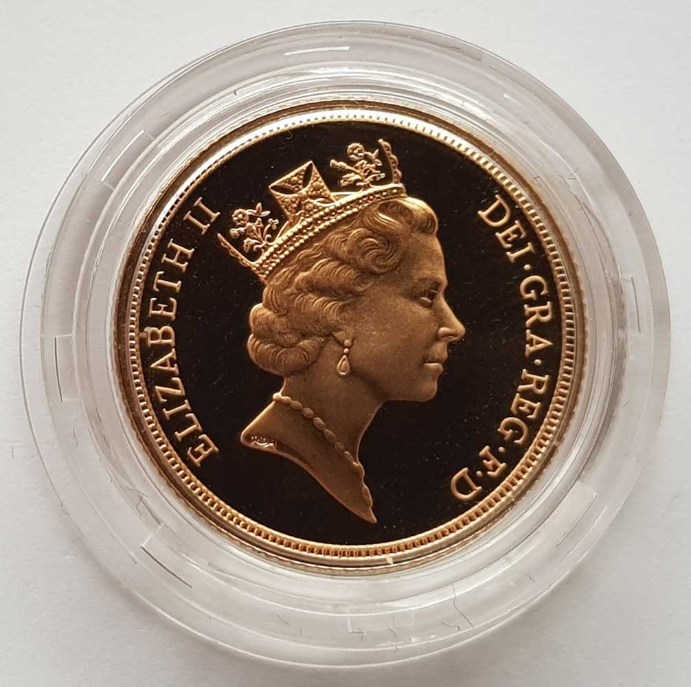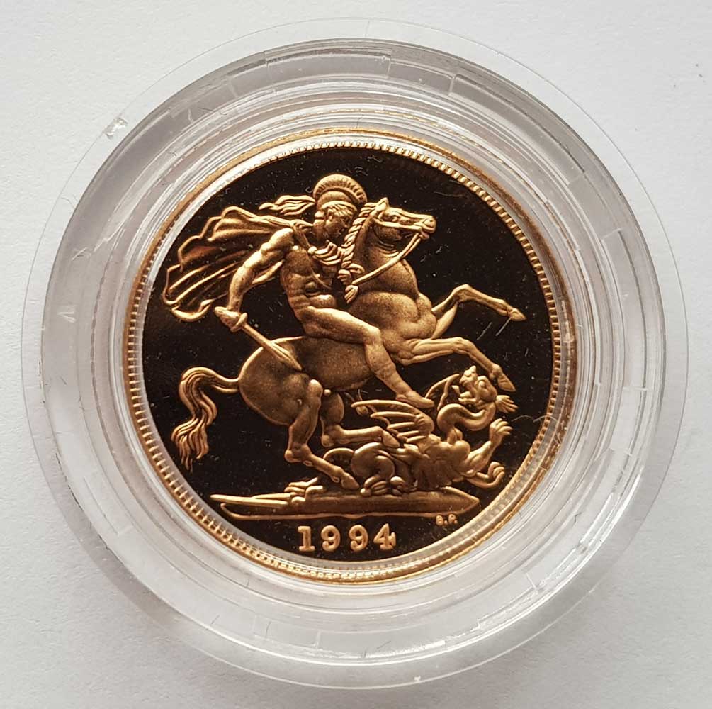 1994 Gold Proof Sovereign Benedetto Pistrucci's famous portrayal of St. George slaying the dragon is depicted on the reverse of the coin. Queen Elizabeth II's third portrait can be seen on the obverse, designed by Raphael Maklouf. The sovereign is made of 22 carat gold, and weighs 7.98 grams. It contains 0.2354 ounce of fine gold. The 1994 gold proof sovereign is housed in a Royal Mint acrylic screw top capsule, presented in its Royal Mint maroon leatherette case, accompanied with an individually numbered certificate of authenticity. Only 5,000 individually boxed proof sovereigns were issued by the Royal Mint in 1994. Looking to SELL GOLD SOVEREIGNS? Please visit our Prices We Pay – Sovereigns Page The first modern gold proof sovereign was issued by the Royal Mint in 1979. Since then, a gold proof sovereign has been issued every year by the Royal Mint. Proof sovereigns are superior in quality compared to standard bullion sovereigns, with highly polished fields, and cameo raised portraits on the obverse and reverse. Gold proof sovereigns are released in a Royal Mint presentation case with a certificate of authenticity. Proof sovereigns often depict Benedetto Pistrucci's famous portrayal of St George and the dragon on the reverse of the coin. The reverse design has been changed several times for special commemorative years, such as the 1989 500th anniversary of the sovereign, and the 2002 Golden Jubilee. M J Hughes Coins are members of the British Numismatic Trade Association – www.bnta.net. We are coin dealers based in Alton, Hampshire (Where we have a shop location). We are always interested in purchasing any coins that you may have for sale, particularly Royal Mint issues and gold coins. We are happy to make no obligation offers, and purchase from a single coin to an entire gold coin collection. You would be more than welcome to visit our shop, or we are happy to travel to you. Please get in contact with us if you would like to discuss further.Summary