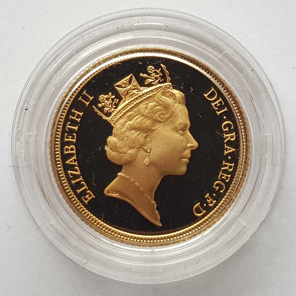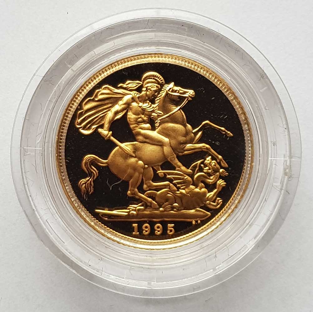 The 1995 Gold Proof Sovereign depicts Benedetto Pistrucci's famous portrayal of St. George slaying the dragon is depicted on the reverse of the coin. Queen Elizabeth II's third portrait can be seen on the obverse, designed by Raphael Maklouf. The sovereign is made of 22 carat gold, and weighs 7.98 grams. It contains 0.2354 ounce of fine gold. The 1995 gold proof sovereign is housed in a Royal Mint acrylic screw top capsule, presented in its Royal Mint maroon leatherette case, accompanied with an individually numbered certificate of authenticity. Only 7,500 individually boxed proof sovereigns were issued by the Royal Mint in 1995. Looking to SELL GOLD SOVEREIGNS? Please visit our Prices We Pay – Sovereigns Page The first modern gold proof sovereign was issued by the Royal Mint in 1979. Since then, a gold proof sovereign has been issued every year by the Royal Mint. Proof sovereigns are superior in quality compared to standard bullion sovereigns, with highly polished fields, and cameo raised portraits on the obverse and reverse. Gold proof sovereigns are released in a Royal Mint presentation case with a certificate of authenticity. Proof sovereigns often depict Benedetto Pistrucci's famous portrayal of St George and the dragon on the reverse of the coin. The reverse design has been changed several times for special commemorative years, such as the 1989 500th anniversary of the sovereign, and the 2002 Golden Jubilee. M J Hughes Coins are members of the British Numismatic Trade Association – www.bnta.net. We are coin dealers based in Alton, Hampshire (Where we have a shop location). We are always interested in purchasing any coins that you may have for sale, particularly Royal Mint issues and gold coins. We are happy to make no obligation offers, and purchase from a single coin to an entire gold coin collection. You would be more than welcome to visit our shop, or we are happy to travel to you. Please get in contact with us if you would like to discuss further.Summary