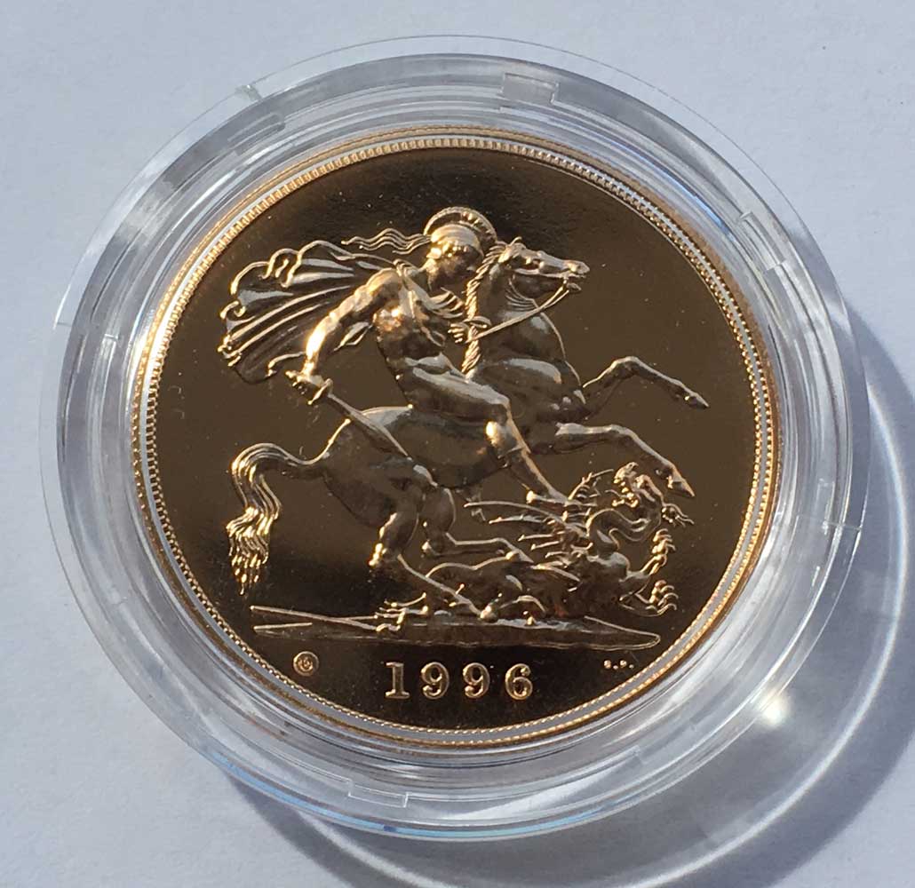 The 1996 Brilliant Uncirculated Gold Five Pounds Piece £5 depicts Benedetto Pistrucci's famous portrayal of St. George slaying the dragon on the reverse of the coin. A small circled 'U' to the left of the date means the coin is of BU quality. Queen Elizabeth II's third portrait can be seen on the obverse of the coin, designed by Raphael Maklouf. The coin is made of solid 22 carat gold (Gold fineness of 0.916), and is housed in its original Royal Mint acrylic screw top capsule. The coin is presented in its Royal Mint green velvet case, accompanied with an individually numbered certificate of authenticity. The 1996 brilliant uncirculated gold five pounds piece has a weight of 39.94 grams, with a diameter of 36.02mm. Only 901 BU gold five pounds pieces were issued by the Royal Mint in 1996. Looking to Sell Gold Coins, take a look at Prices We Pay The first gold five pound piece (£5) was issued during the reign of King George III in 1820. It was not issued as a circulation piece, but for the collectors market only. Gold five pounds pieces were also issued in 1826 and 1839 as part of a proof coin set. It wasn't until 1887 when a gold five pounds piece was issued for circulation purposes. There are two basic kinds of gold five pounds coin: the gold £5 (quintuple sovereign) type and the gold Crown. They are both made of 22 carat gold, and weigh exactly the same (39.94 grams). The diameter of the gold crown is slightly larger than the £5 piece. The first Brilliant Uncirculated gold five pounds was issued by the Royal Mint in 1984, and has been issued every year to present. M J Hughes Coins are members of the British Numismatic Trade Association – www.bnta.net. We are coin dealers based in Alton, Hampshire (Where we have a shop location). We are always interested in purchasing any coins that you may have for sale, particularly Royal Mint issues and gold coins. We are happy to make no obligation offers, and purchase from a single coin to an entire gold coin collection. You would be more than welcome to visit our shop, or we are happy to travel to you. Please get in contact with us if you would like to discuss further.Summary