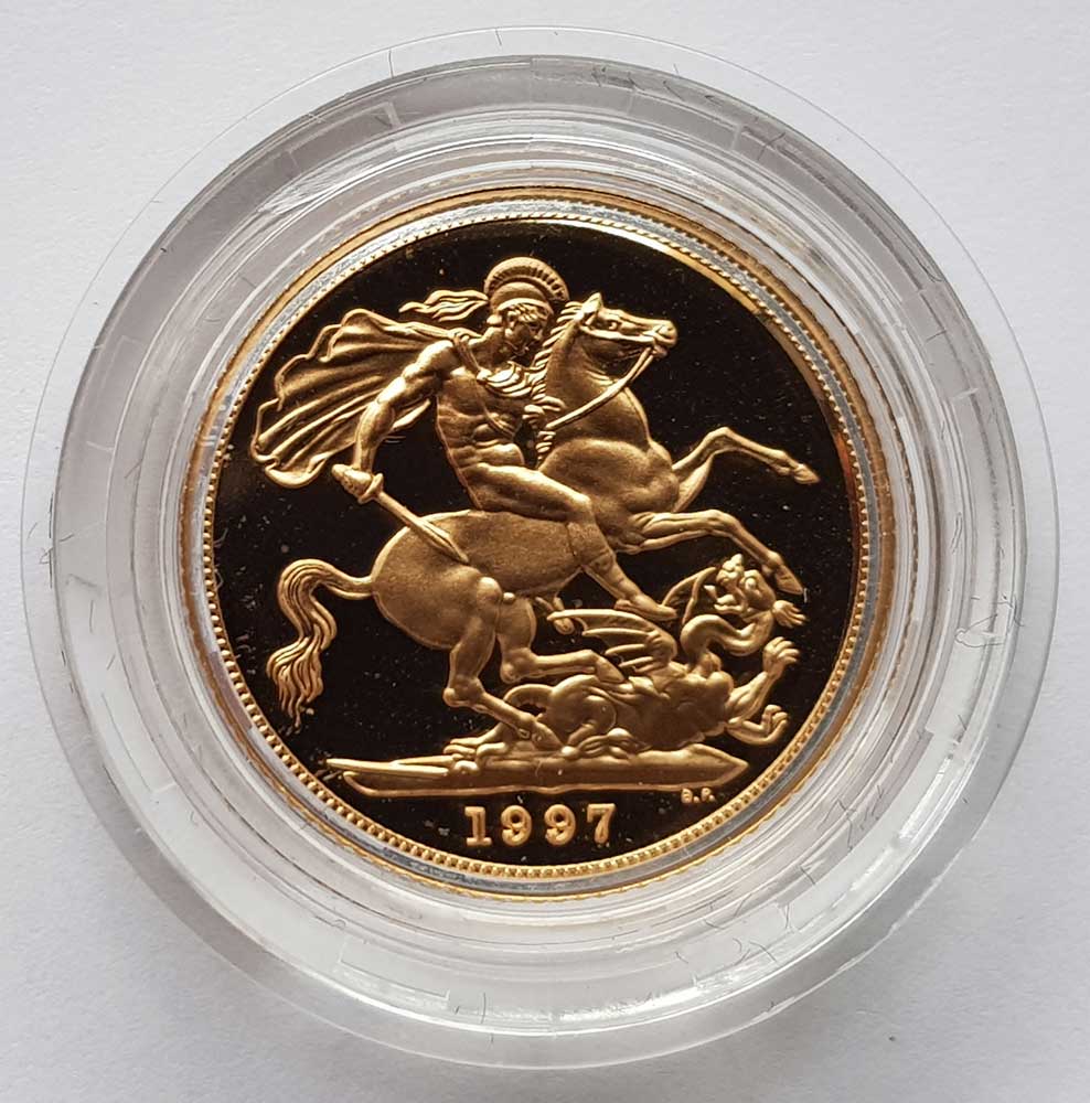Benedetto Pistrucci’s famous portrayal of St. George slaying the dragon is depicted on the reverse of the coin. Queen Elizabeth II’s second portrait can be seen on the obverse, designed by Raphael Maklouf. The sovereign is made of solid 22 carat gold (Gold Fineness of 0.916), and weighs 7.98 grams. It has a diameter of 22.05mm. The coin is housed in its original Royal Mint acrylic screw top capsule, presented in its Royal Mint red leatherette presentation box case, accompanied with a certificate of authenticity. Only 9,177 individually boxed proof sovereigns were issued by the Royal Mint in 1997. *We are always interested in purchasing 1997 proof sovereigns and offer fair market prices. Our contact details can be found at the bottom of the page.Summary