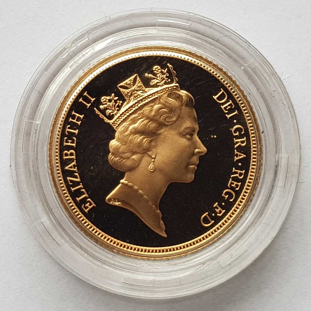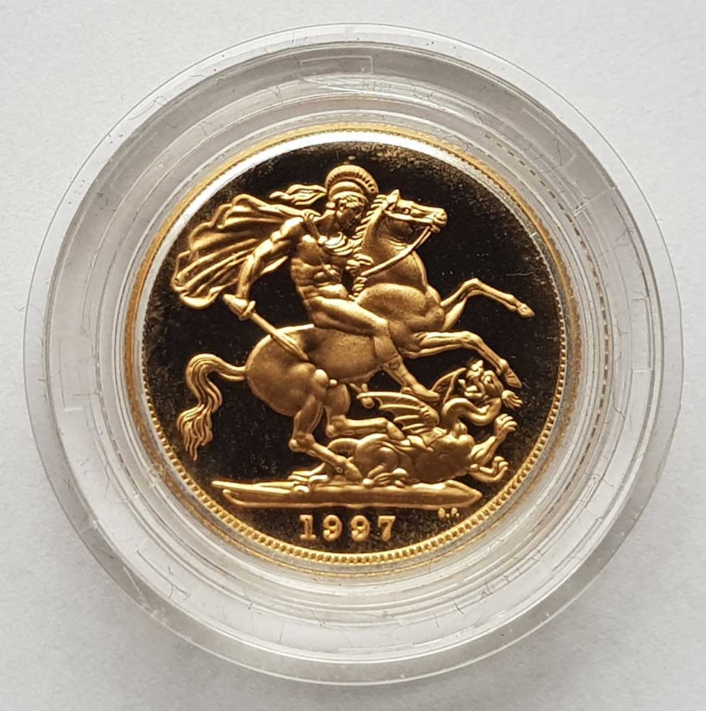 The 1997 Gold Proof Sovereign depicts Benedetto Pistrucci's famous portrayal of St. George slaying the dragon is depicted on the reverse of the coin. Queen Elizabeth II's third portrait can be seen on the obverse, designed by Raphael Maklouf. The sovereign is made of 22 carat gold, and weighs 7.98 grams. It contains 0.2354 ounce of fine gold. The 1997 gold proof sovereign is housed in a Royal Mint acrylic screw top capsule, presented in its Royal Mint maroon leatherette case, accompanied with an individually numbered certificate of authenticity. Only 7,500 individually boxed proof sovereigns were issued by the Royal Mint in 1997. Looking to SELL GOLD SOVEREIGNS? Please visit our Prices We Pay – Sovereigns Page The first modern gold proof sovereign was issued by the Royal Mint in 1979. Since then, a gold proof sovereign has been issued every year by the Royal Mint. Proof sovereigns are superior in quality compared to standard bullion sovereigns, with highly polished fields, and cameo raised portraits on the obverse and reverse. Gold proof sovereigns are released in a Royal Mint presentation case with a certificate of authenticity. Proof sovereigns often depict Benedetto Pistrucci's famous portrayal of St George and the dragon on the reverse of the coin. The reverse design has been changed several times for special commemorative years, such as the 1989 500th anniversary of the sovereign, and the 2002 Golden Jubilee. M J Hughes Coins are members of the British Numismatic Trade Association – www.bnta.net. We are coin dealers based in Alton, Hampshire (Where we have a shop location). We are always interested in purchasing any coins that you may have for sale, particularly Royal Mint issues and gold coins. We are happy to make no obligation offers, and purchase from a single coin to an entire gold coin collection. You would be more than welcome to visit our shop, or we are happy to travel to you. Please get in contact with us if you would like to discuss further.Summary