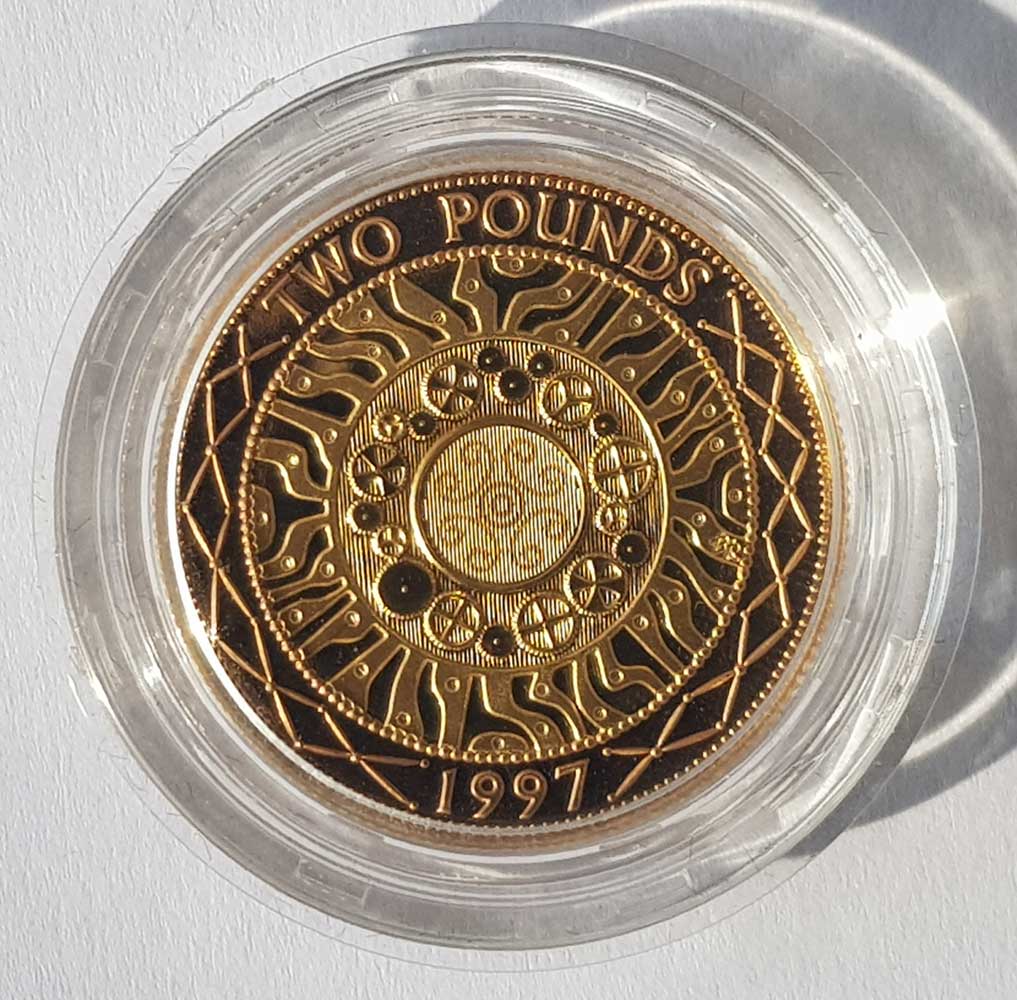 The 1997 gold proof two pounds piece commemorates the advancements in technology. Designed by Bruce Rushin, the reverse features four concentric circles representing the Iron Age, 18th century industrial development, silicon chip and the internet. The edge inscription reads 'STANDING ON THE SHOULDERS OF GIANTS'. Queen Elizabeth II's third portrait can be seen on the obverse, designed by Raphael Maklouf. The gold two pounds piece is made of 22 carat gold (Gold Fineness of 0.916), and weighs 15.98 grams. It has a diameter of 28.40mm. The outer disc is made of 'red' gold, with the inner disc being 'yellow' gold. The coin is housed in its original Royal Mint acrylic screw top capsule, presented in its Royal Mint green leatherette case, accompanied with an individually numbered certificate of authenticity. Only 2,482 1997 gold proof two pounds pieces were issued by the Royal Mint in 1997. Looking to Sell Gold Coins, take a look at Prices We Pay The first gold two pounds piece (£2) was issued during the reign of King George III in 1820. It was not issued as a circulation piece, but for the collectors market only. The first circulation gold two pounds piece was issued in 1823 (King George IV), with a gold proof two pounds piece minted in 1831 as part of the 1831 proof coin set. Further circulation and proof issues were produced during the reign of Queen Victoria in 1887 and 1893. All gold two pounds pieces are made of 22 carat gold, and weigh 15.98 grams. They have a diameter of 28.40mm. The gold two pounds coin is sometimes referred to as a 'Double Sovereign', as it is exactly double the weight of a gold sovereign. Since 1986, with the issue of the Glasgow Commonwealth Games gold two pounds piece, two types have been frequently produced: the commemorative gold two pounds and the St George design. The St George and the dragon gold two pounds is often included in the sovereign series sets. M J Hughes Coins are members of the British Numismatic Trade Association – www.bnta.net. We are coin dealers based in Alton, Hampshire (Where we have a shop location). We are always interested in purchasing any coins that you may have for sale, particularly Royal Mint issues and gold coins. We are happy to make no obligation offers, and purchase from a single coin to an entire gold coin collection. You would be more than welcome to visit our shop, or we are happy to travel to you. Please get in contact with us if you would like to discuss further.Summary