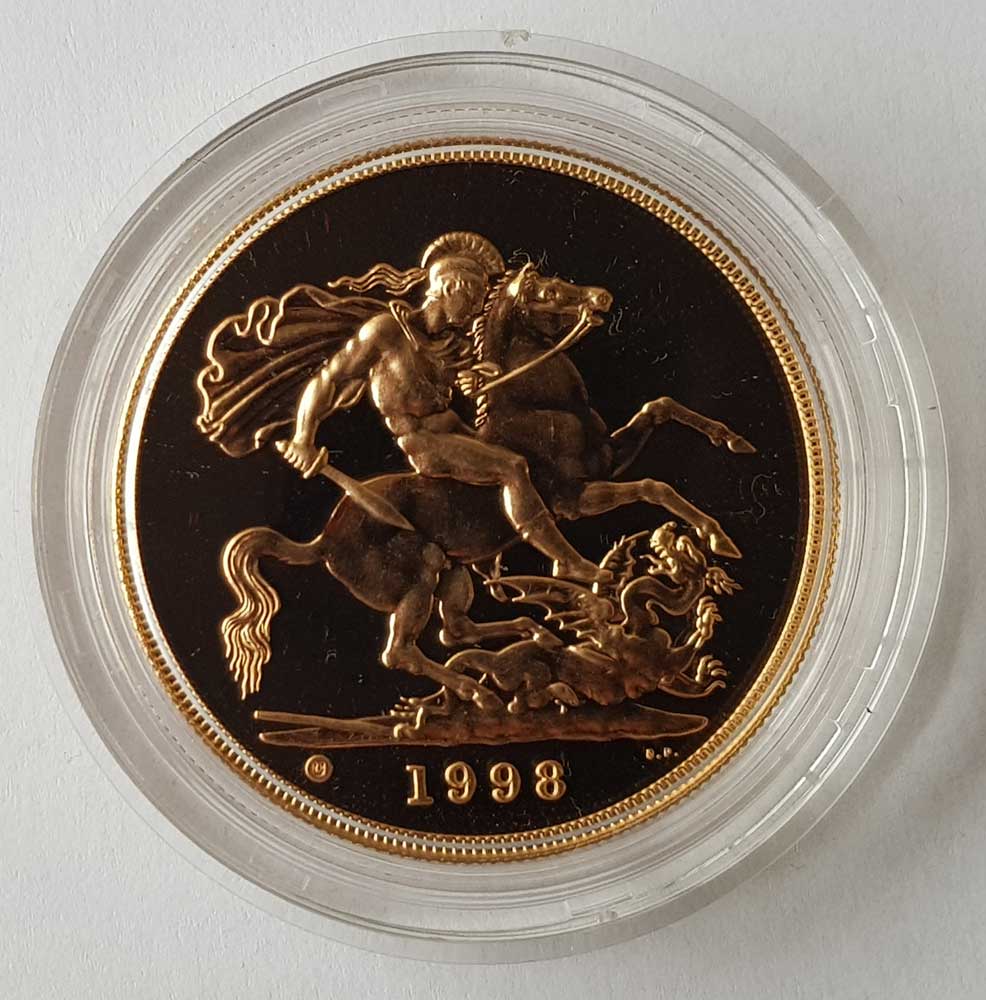 The 1998 brilliant uncirculated gold five pounds piece has a weight of 39.94 grams, with a diameter of 36.02mm.