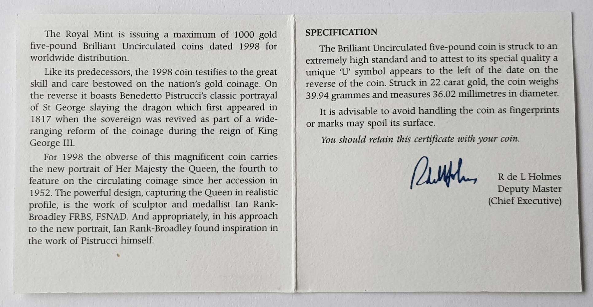 Only 825 BU gold five pounds pieces were issued by the Royal Mint in 1998.