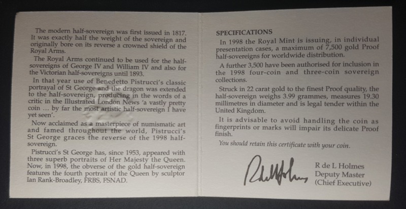 The 1998 Gold Proof Half-Sovereign is an example of the Gold Half-Sovereign and is a gold coin, being as it suggests, half the value and half of the gold weight of a gold sovereign. Today, the half-sovereign is a commemorative coin, not issued every year and often only collected as part of a set.