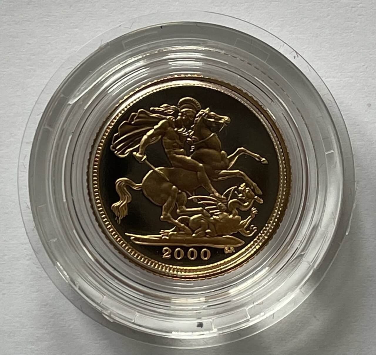 The 2000 Gold Proof Half-Sovereign (Millennium Gold Proof Half-Sovereign) is an example of the Gold Half-Sovereign and is a gold coin, being as it suggests, half the value and half of the gold weight of a gold sovereign. Today, the half-sovereign is a commemorative coin, not issued every year and often only collected as part of a set.
