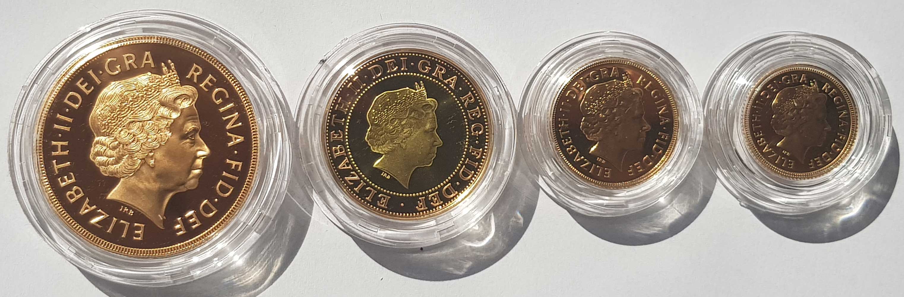 The set contains a gold proof five pounds (£5), two pounds (£2), sovereign and half sovereign.