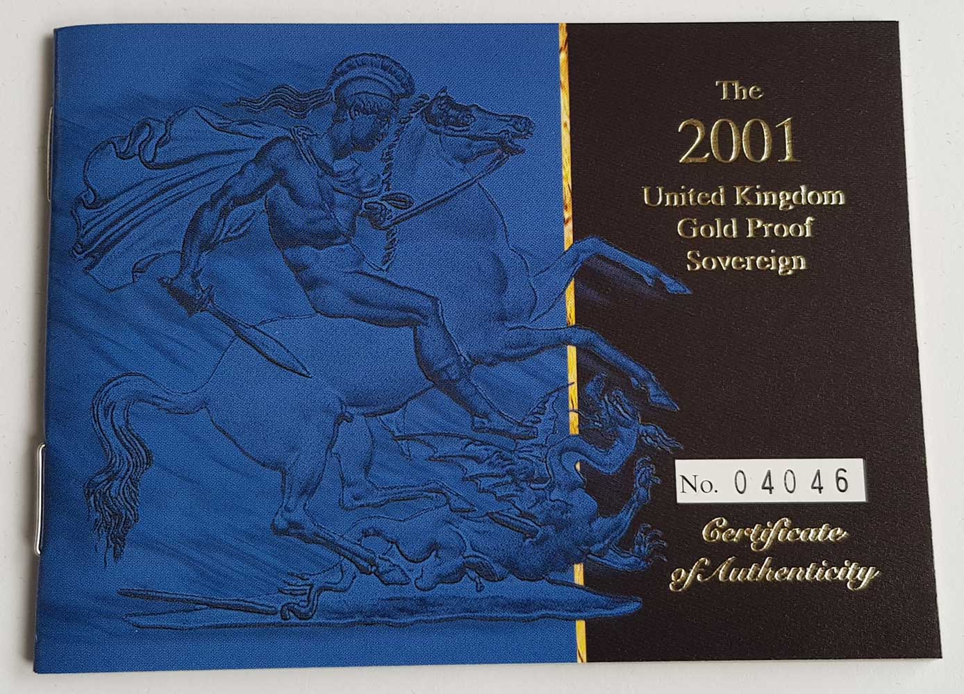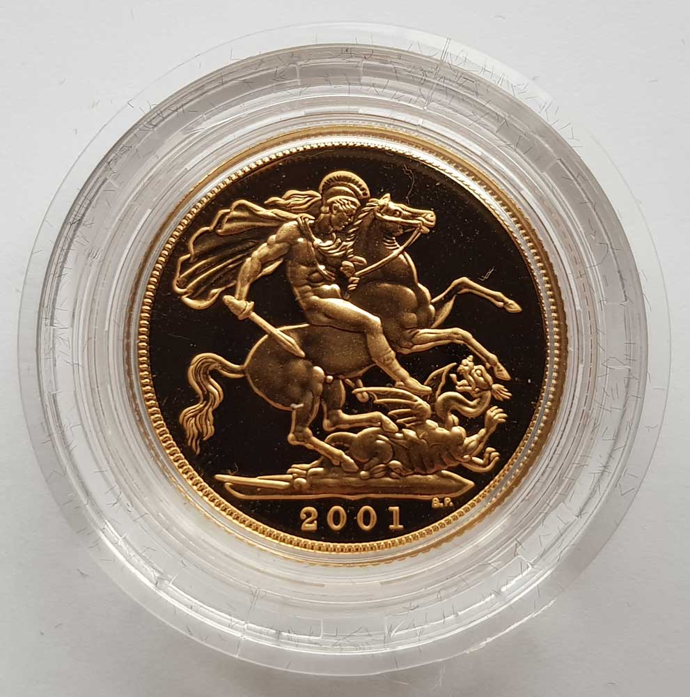 2001 Gold Proof Sovereign Bendetto Pistrucci's famous portrayal of St. George slaying the dragon is depicted on the reverse of the coin. Queen Elizabeth II's fourth portrait can be seen on the obverse, designed by Ian Rank-Broadley. The sovereign is made of 22 carat gold, and weighs 7.98 grams. It contains 0.2354 ounce of fine gold. The 2001 gold proof sovereign is housed in a Royal Mint acrylic screw top capsule, presented in its Royal Mint velvet case with outer black card box, accompanied with an individually numbered certificate of authenticity. Only 12,500 individually boxed proof sovereigns were issued by the Royal Mint in 2001. Looking to SELL GOLD SOVEREIGNS? Please visit our Prices We Pay – Sovereigns Page The first modern gold proof sovereign was issued by the Royal Mint in 1979. Since then, a gold proof sovereign has been issued every year by the Royal Mint. Proof sovereigns are superior in quality compared to standard bullion sovereigns, with highly polished fields, and cameo raised portraits on the obverse and reverse. Gold proof sovereigns are released in a Royal Mint presentation case with a certificate of authenticity. Proof sovereigns often depict Benedetto Pistrucci's famous portrayal of St George and the dragon on the reverse of the coin. The reverse design has been changed several times for special commemorative years, such as the 1989 500th anniversary of the sovereign, and the 2002 Golden Jubilee. M J Hughes Coins are members of the British Numismatic Trade Association – www.bnta.net. We are coin dealers based in Alton, Hampshire (Where we have a shop location). We are always interested in purchasing any coins that you may have for sale, particularly Royal Mint issues and gold coins. We are happy to make no obligation offers, and purchase from a single coin to an entire gold coin collection. You would be more than welcome to visit our shop, or we are happy to travel to you. Please get in contact with us if you would like to discuss further.Summary