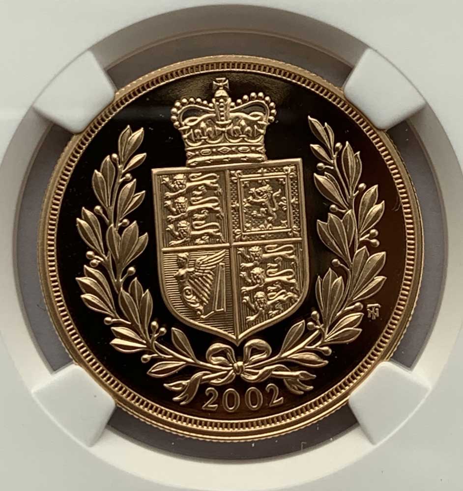 The set contains a 2002 gold proof five pounds, two pounds, sovereign and half sovereign. All of the coins have been slabbed and graded by NGC as PR70. The 2002 4 coin gold proof sovereign set features a shield design on the reverse of the coins, to commemorate the Golden Jubilee of Queen Elizabeth II (Designed by Timothy Noad). The Queens fourth portrait can be seen on the obverses of the coins (Designed by Ian Rank-Broadley). Each coin is made of 22 carat gold. The 2002 4 coin gold proof sovereign set was originally issued with a box and certificate, and had a maximum mintage of 3,000.Summary