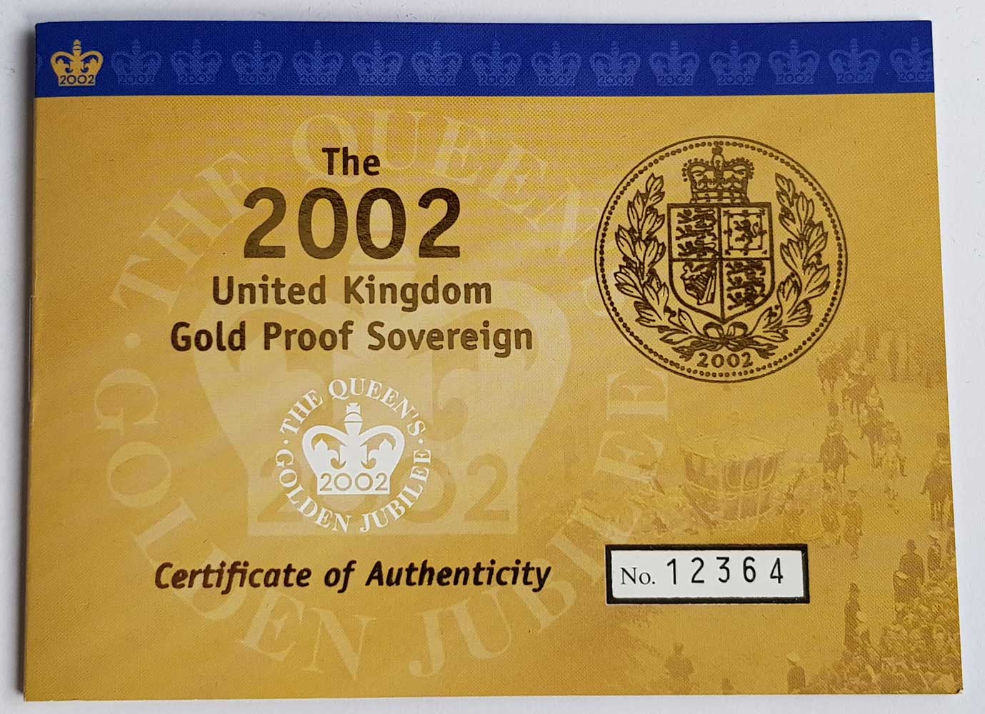 2002 Gold Proof Sovereign Timothy Noad's Shield design is depicted on the reverse of the coin. Queen Elizabeth II's fourth portrait can be seen on the obverse, designed by Ian Rank-Broadley. The sovereign is made of 22 carat gold, and weighs 7.98 grams. It contains 0.2354 ounce of fine gold. The 2002 gold proof sovereign is housed in a Royal Mint acrylic screw top capsule, presented in its Royal Mint velvet case with outer black card box, accompanied with an individually numbered certificate of authenticity. Only 12,500 individually boxed proof sovereigns were issued by the Royal Mint in 2002. Looking to SELL GOLD SOVEREIGNS? Please visit our Prices We Pay – Sovereigns Page The first modern gold proof sovereign was issued by the Royal Mint in 1979. Since then, a gold proof sovereign has been issued every year by the Royal Mint. Proof sovereigns are superior in quality compared to standard bullion sovereigns, with highly polished fields, and cameo raised portraits on the obverse and reverse. Gold proof sovereigns are released in a Royal Mint presentation case with a certificate of authenticity. Proof sovereigns often depict Benedetto Pistrucci's famous portrayal of St George and the dragon on the reverse of the coin. The reverse design has been changed several times for special commemorative years, such as the 1989 500th anniversary of the sovereign, and the 2002 Golden Jubilee. M J Hughes Coins are members of the British Numismatic Trade Association – www.bnta.net. We are coin dealers based in Alton, Hampshire (Where we have a shop location). We are always interested in purchasing any coins that you may have for sale, particularly Royal Mint issues and gold coins. We are happy to make no obligation offers, and purchase from a single coin to an entire gold coin collection. You would be more than welcome to visit our shop, or we are happy to travel to you. Please get in contact with us if you would like to discuss further.Summary