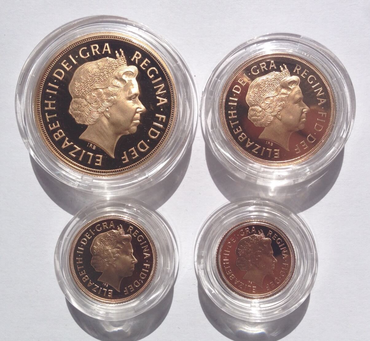 The set contains a gold proof five pounds (£5), two pounds (£2), sovereign and half sovereign. Benedetto Pistrucci's famous portrayal of St. George slaying the dragon is depicted on each of the reverses.