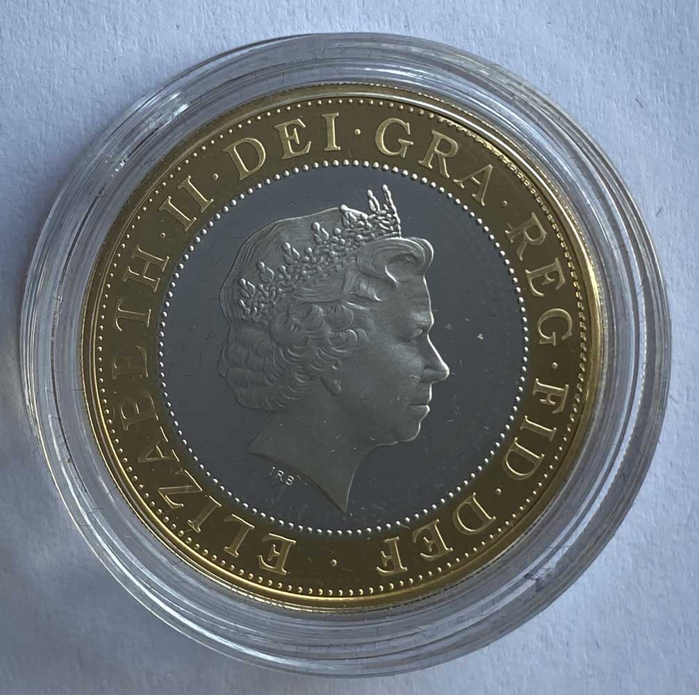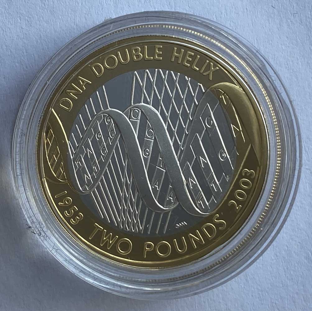 Sterling Silver .925 Weight: 12 g Diameter: 28.40 millimeters This Two-Pound Coin Celebrates the Fiftieth Anniversary of the Discover of the Structure of DNA by Francis Crick and James Watson. The reverse shows a celebration of the discovery of the structure of the DNA molecule by John Mills. The obverse features Ian Rank Broadley's mature, reflective portrait of Her Majesty Queen Elizabeth II.Summary