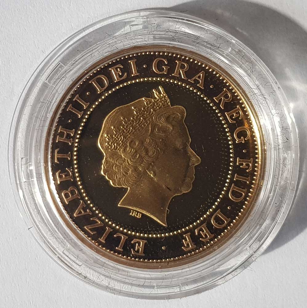 The two pounds piece is made of 22 carat gold (Gold Fineness of 0.916), and weighs 15.98 grams. It has a diameter of 28.40mm. The outer disc is made of 'red' gold, with the inner disc being 'yellow' gold.